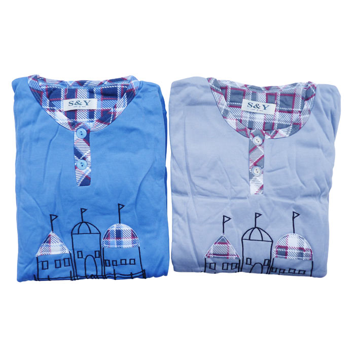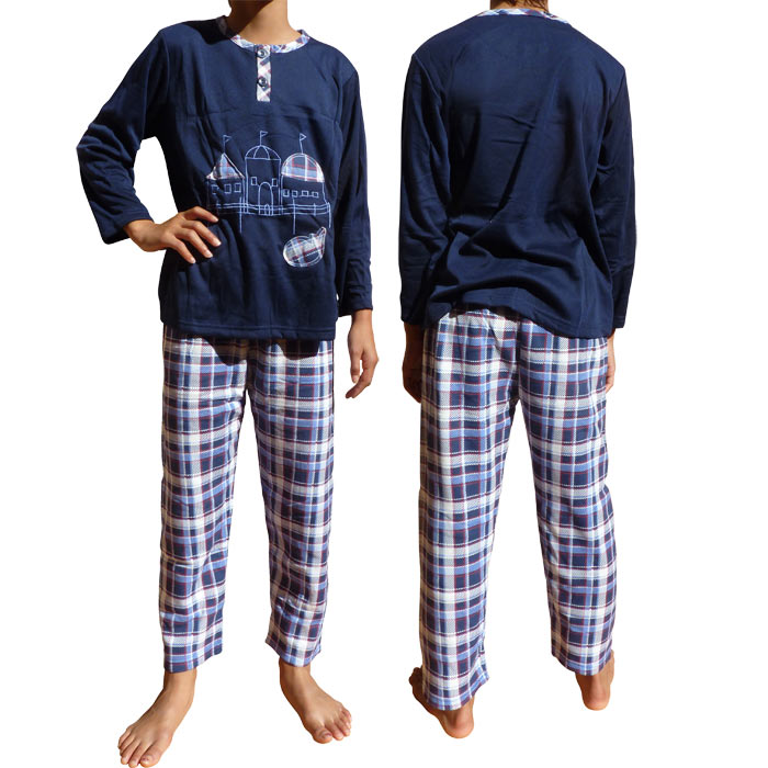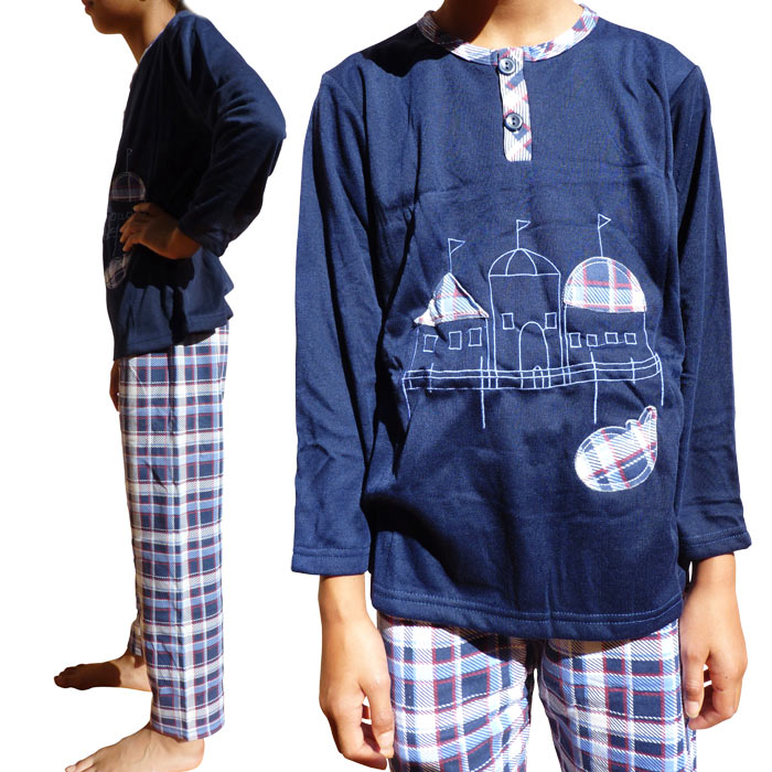 Pyjama enfant manche longue, 80% coton, pour garçon de 4 à 14 ans,. Intérieur flanelle pilou. Col rond boutonné avec liseré contrasté au niveau du col. Pyjama uni avec broderie "châteaux" sur le devant de la tunique. . Pantalon à carreaux élastiqué à la taille. 6 tailles, vendu par lot de 6 pièces.