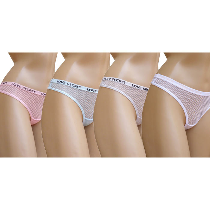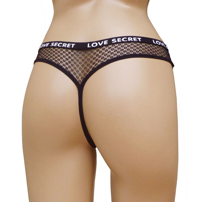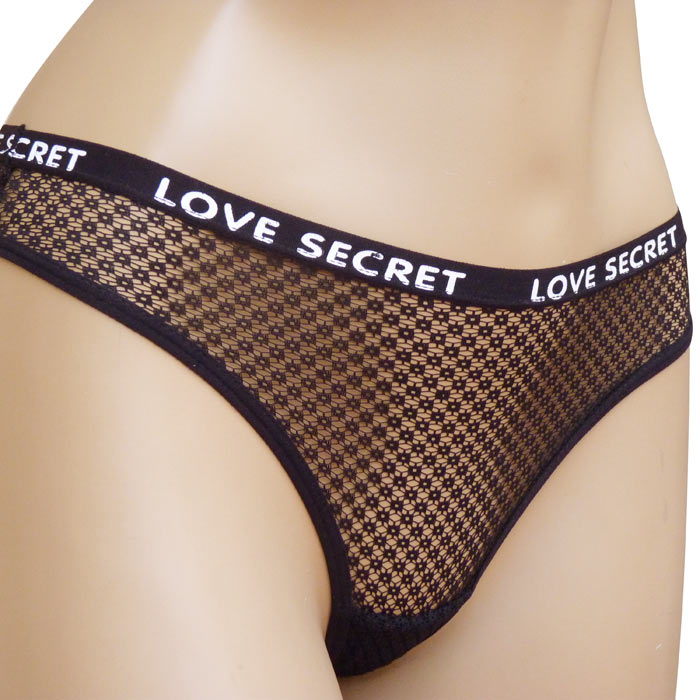 Tanga. Broderie sur maille filet stretch. Doublé sur le fond. Elastiqué à la taille avec inscription "love secret" sur le pourtour. Taille unique.
