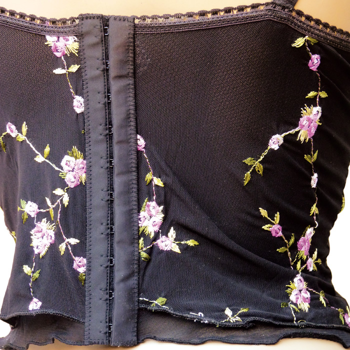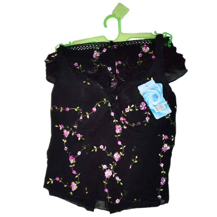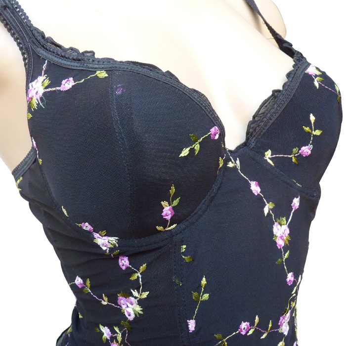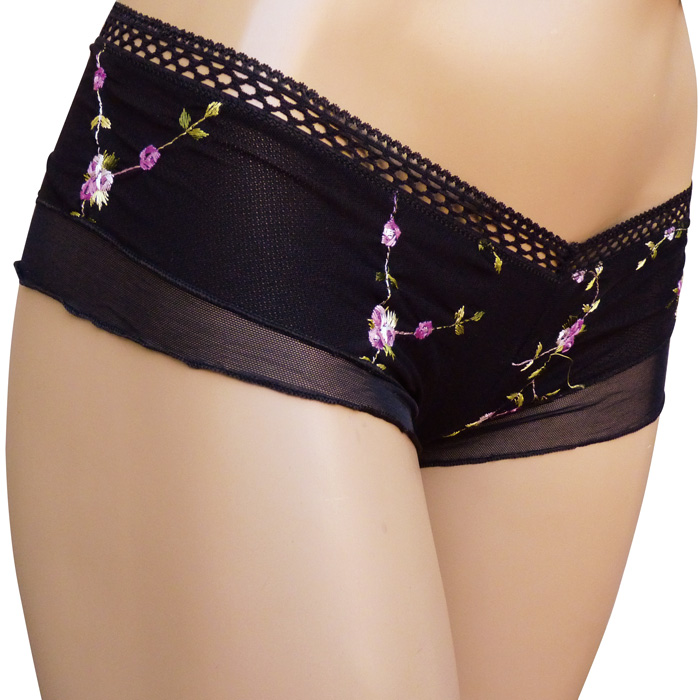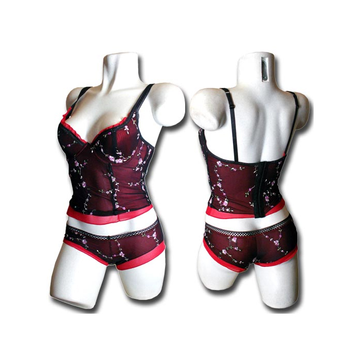 Ensemble bustier avec boxer. Soutien gorge rembourré fin. Bonnet B. 2 voiles superposés. Petites fleurs brodées. Bustier avec fermeture agrafes dans le dos. Bretelles réglables. Boxer, rappel fleurs brodées, voiles fins sur le pourtour des cuisses, élastique résille sur le pourtour de la taille. 6 tailles.