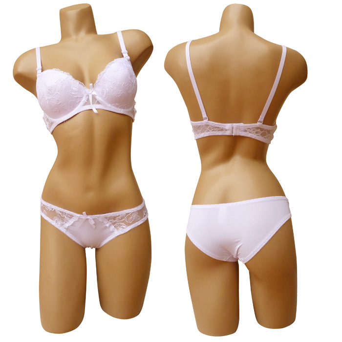 Ensemble soutien gorge avec slip. Soutien-gorge coques souples avec armatures, bonnet C. Dentelle sur maille résille stretch. Nœud satiné entre-bonnet. Bretelles réglables et amovibles. Fermeture agrafes dans le dos. Culotte avec 2 triangles de dentelle de chaque côté. 6 tailles : 85C au 110C.livré sur cintre.