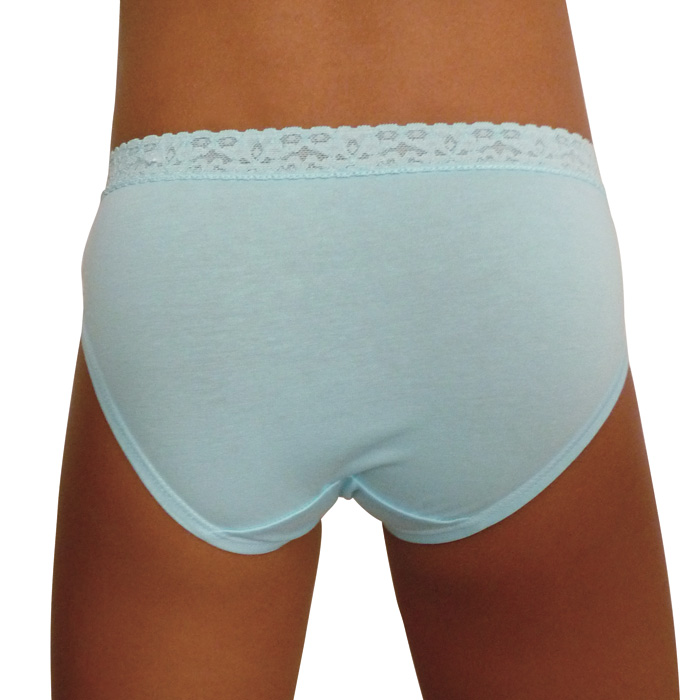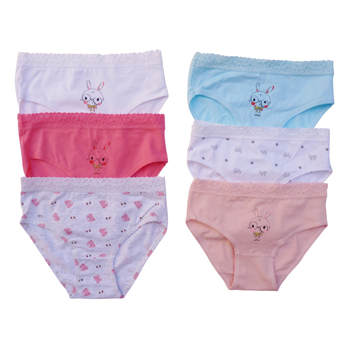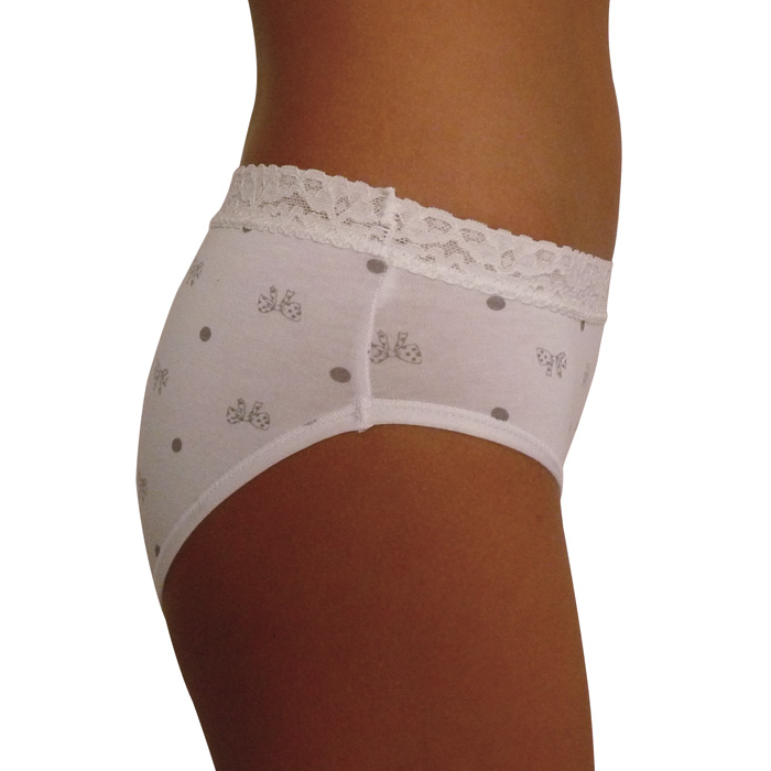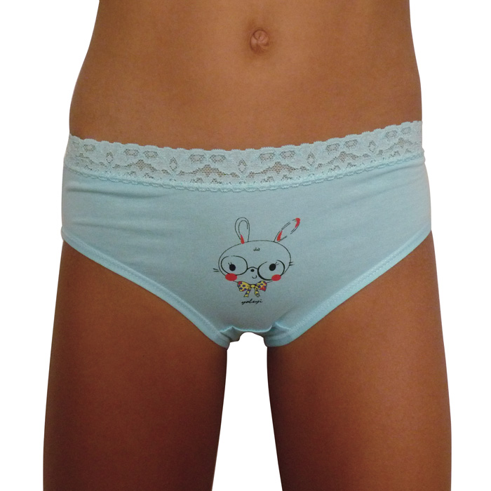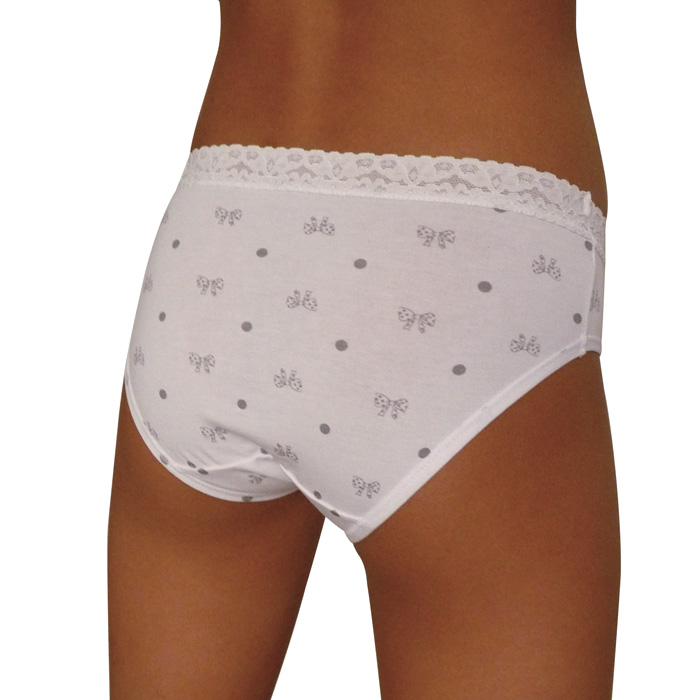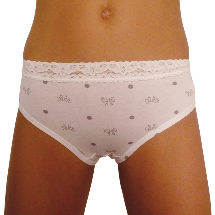 Slip fille coton majoritaire, culotte unie avec bande élastique en dentelle à la taille. Imprimé "nœud papillons, nounours, lapin...". 4 tailles : 2/4 ans, 5/7 ans, 8/10 ans, 11/12 ans.