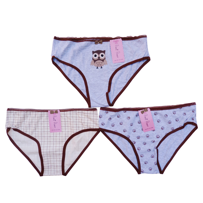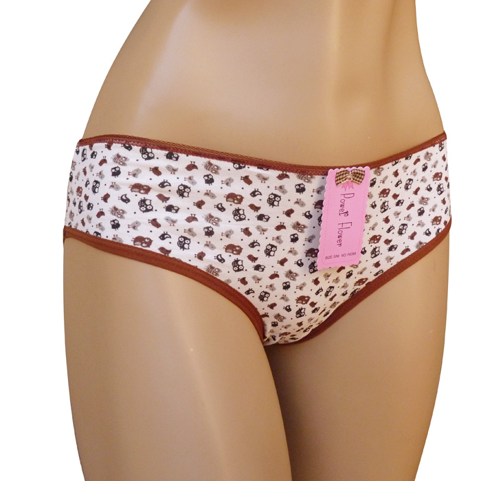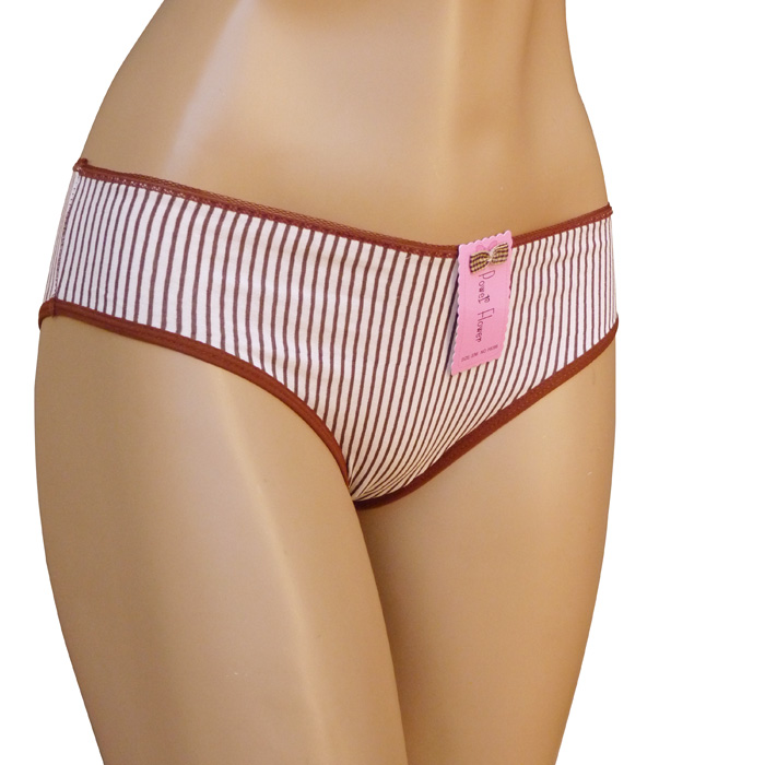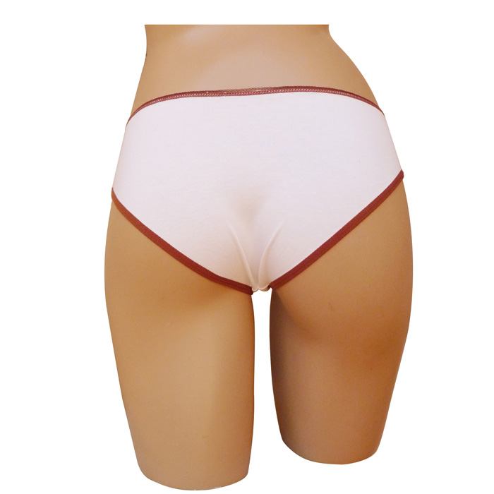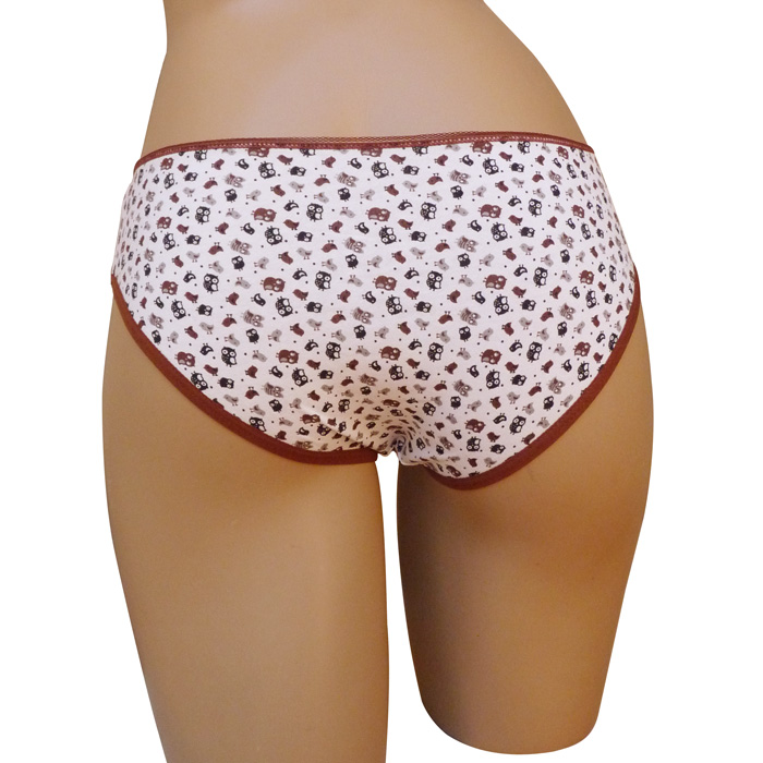 Slip femme coton majoritaire dans les tons blanc, gris chiné et chocolat. Imprimé différents sur l'ensemble de la culotte, "carreaux, rayures, pattes de chats, hiboux" ou simplement uni avec un motif sur le devant orné d'un petit nœud à carreaux à l'avant. Dentelé sur le pourtour de la taille. Liseré contrasté sur le pourtour des cuisses. 2 tailles.