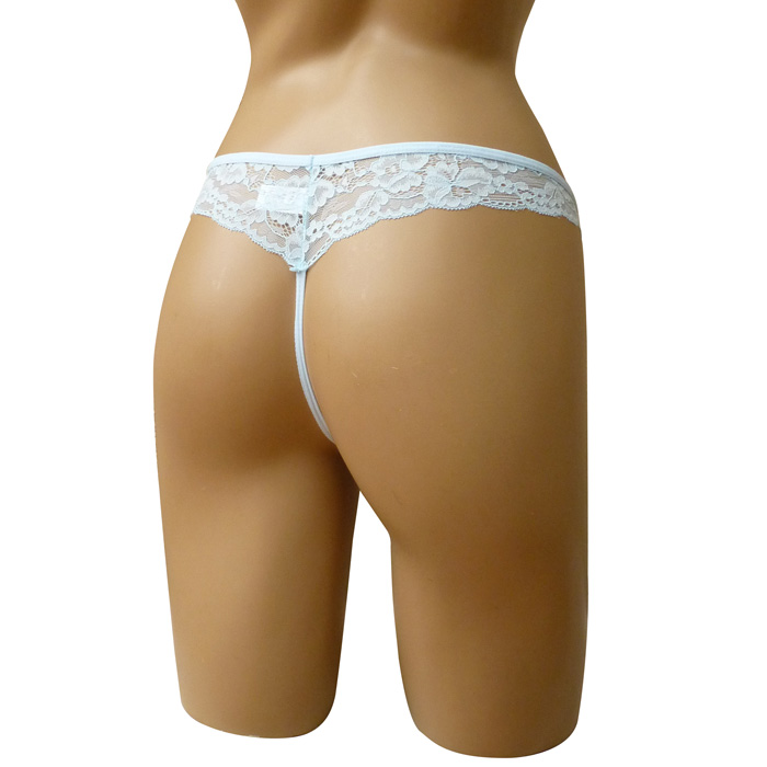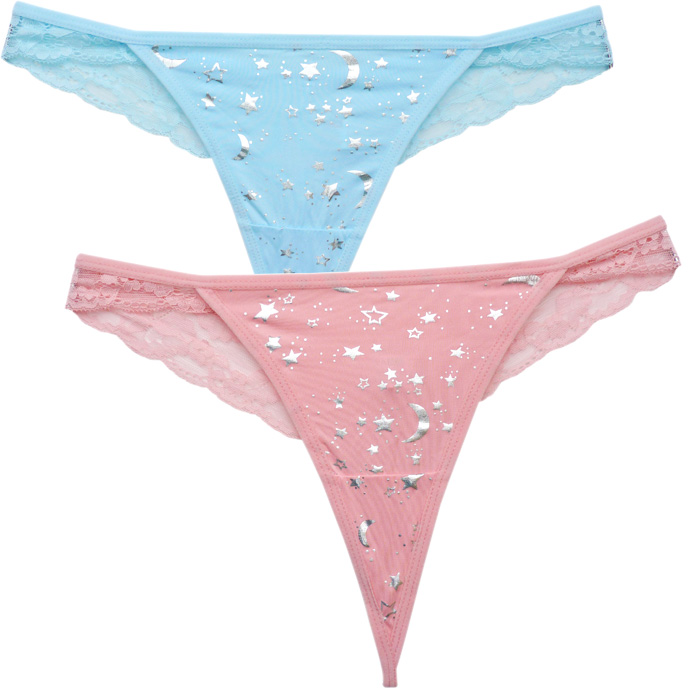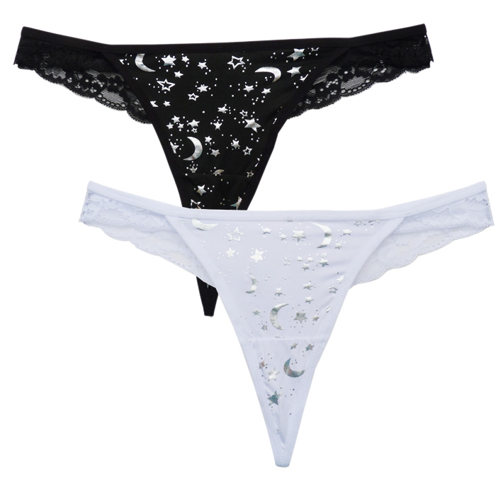 Tanga en microfibre sur le devant avec "étoiles, lunes et pois argentés". Dentelle sur les côtés et à l'arrière. Élastiquée à la taille. Taille unique.