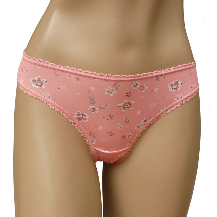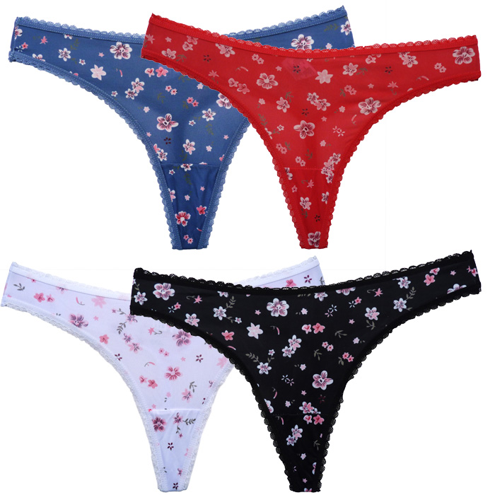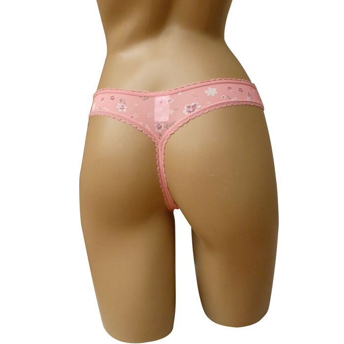 Tanga en microfibre lycra, imprimé floral sur l'ensemble. Dentelé à la taille et sur le pourtour des cuisses. Élastiquée à la taille. Doublé sur le fond du string. Taille unique.