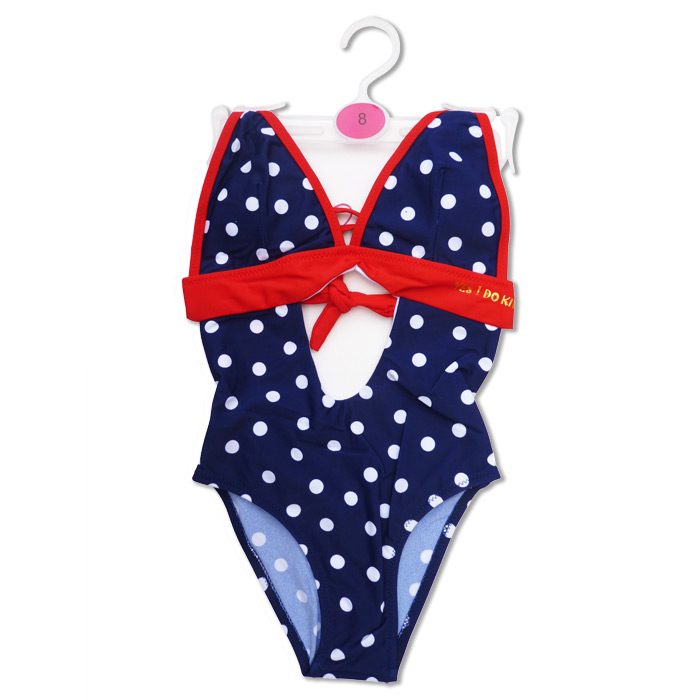 Maillot de bain fille 1 pièce. Maillot doublé à l'avant. Soutien-gorge forme triangle avec mousse amovibles. S'attache dans le dos. Bretelle réglable autour du cou. Imprimé pois blanc sur l'ensemble du maillot. 5 tailles : de 4 ans à 12 ans.