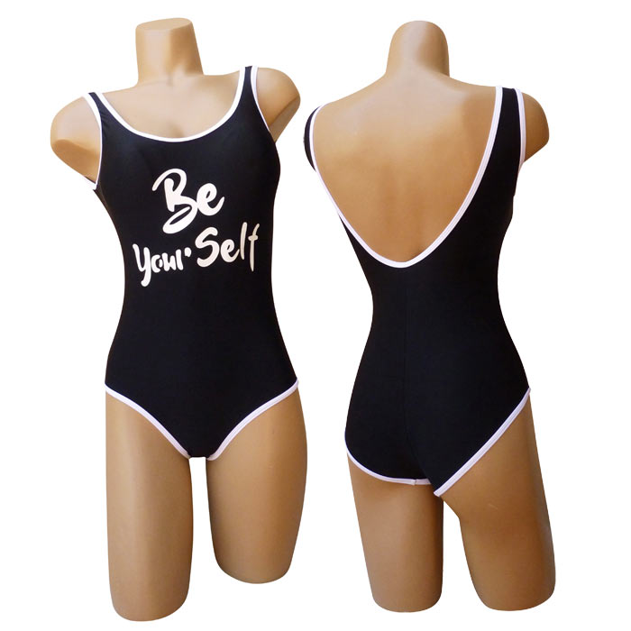 Maillot de bain femme 1 pièce, doublé à l'avant. Maillot uni, encolure arrondie, liseré contrasté sur le pourtour du maillot, inscription "Be Your self" sur le devant. Mousses amovibles. 5 tailles indiquées sur étiquette (taille européenne).