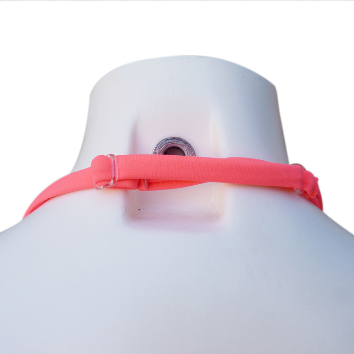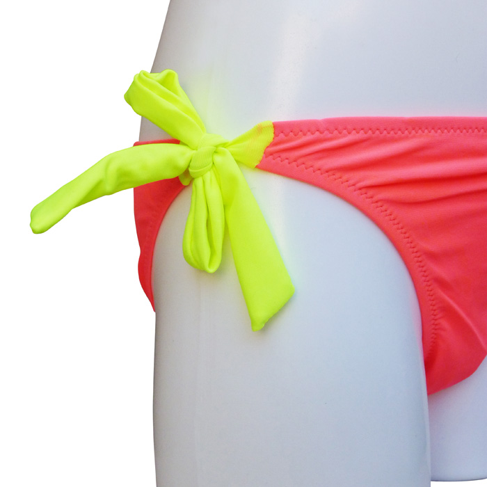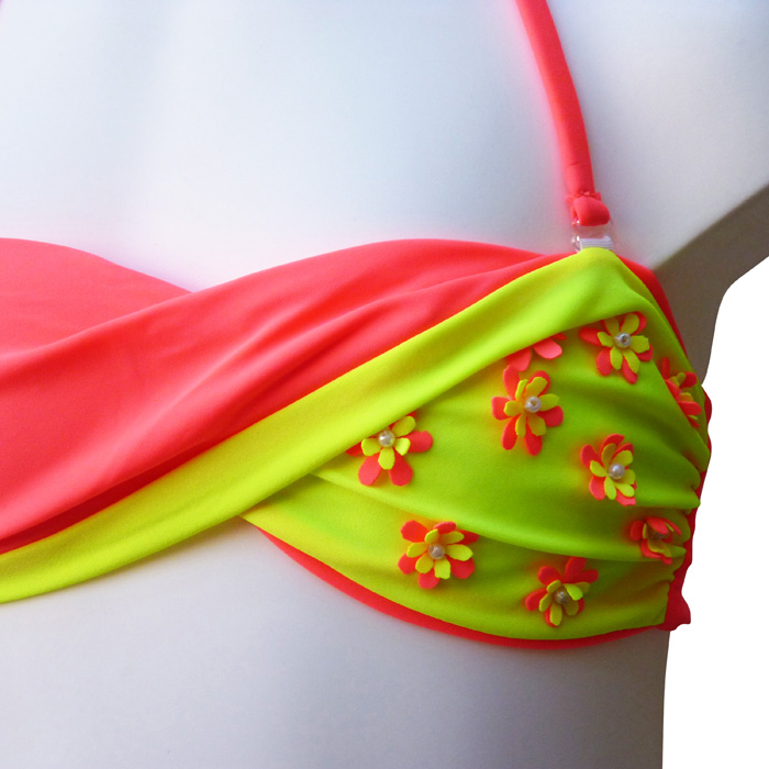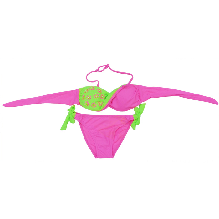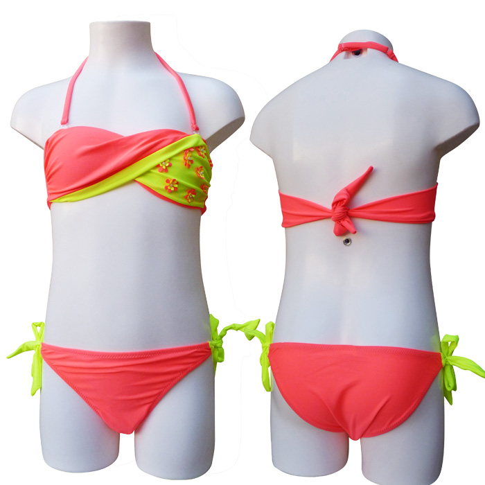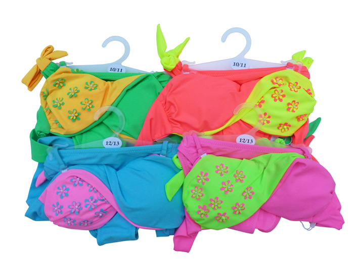 Maillot de bain filles 2 pièces. Soutien gorge forme bandeau, effet twisté sur le soutien gorge. Fines brides amovibles et réglable au cou et se nouent au dos. Slip doublé à l'avant, se noue sur les côtés. Motif "fleurs bicolores" sur un des bonnets. 4 tailles :- 10/11 ans - 12/13 ans - 14/15 ans - 16/17 ans