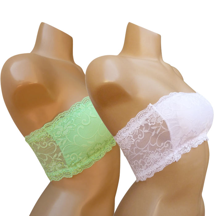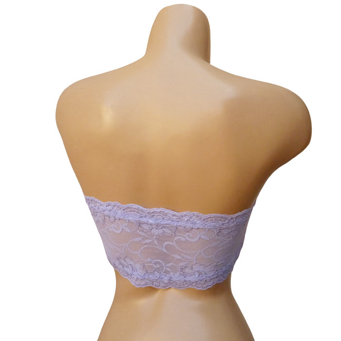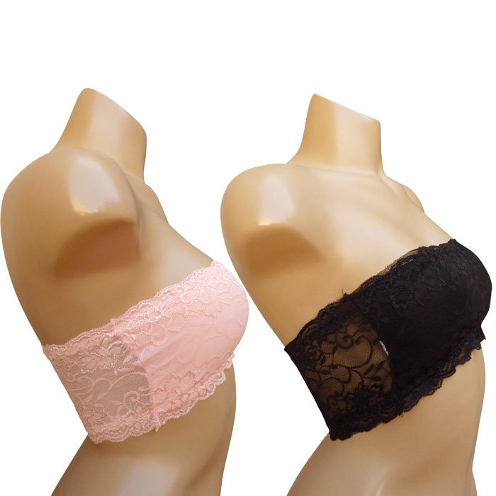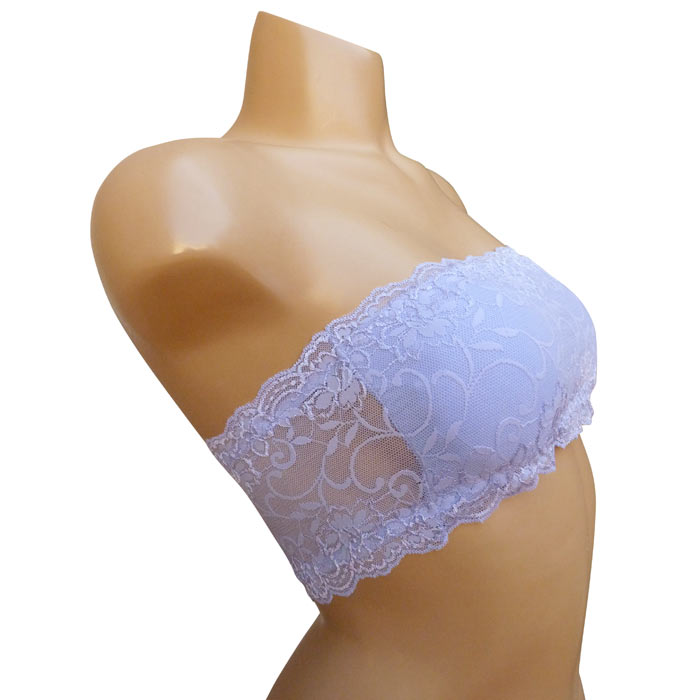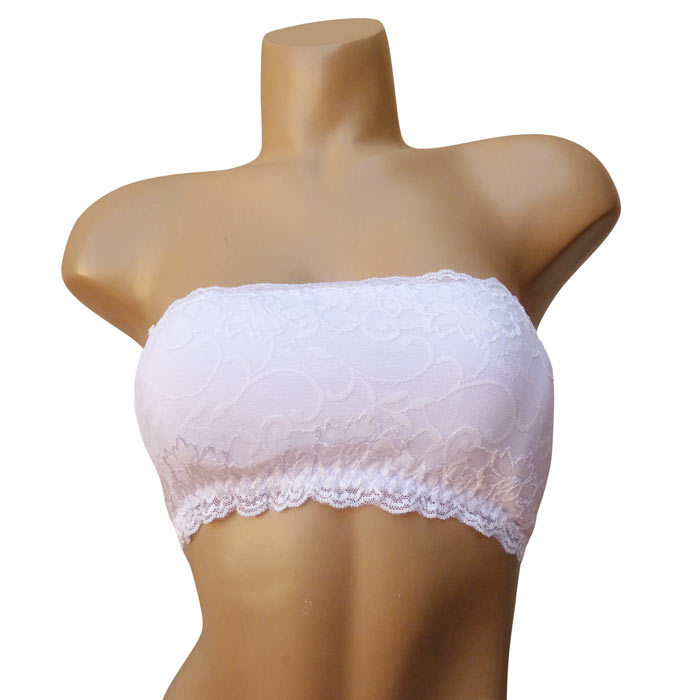 Soutien gorge bandeau non rembourré avec coussinets amovibles. Dentelle fleurie sur l'ensemble du bandeau. Livré avec brides amovibles en silicone. 2 tailles : S/M - L/XL