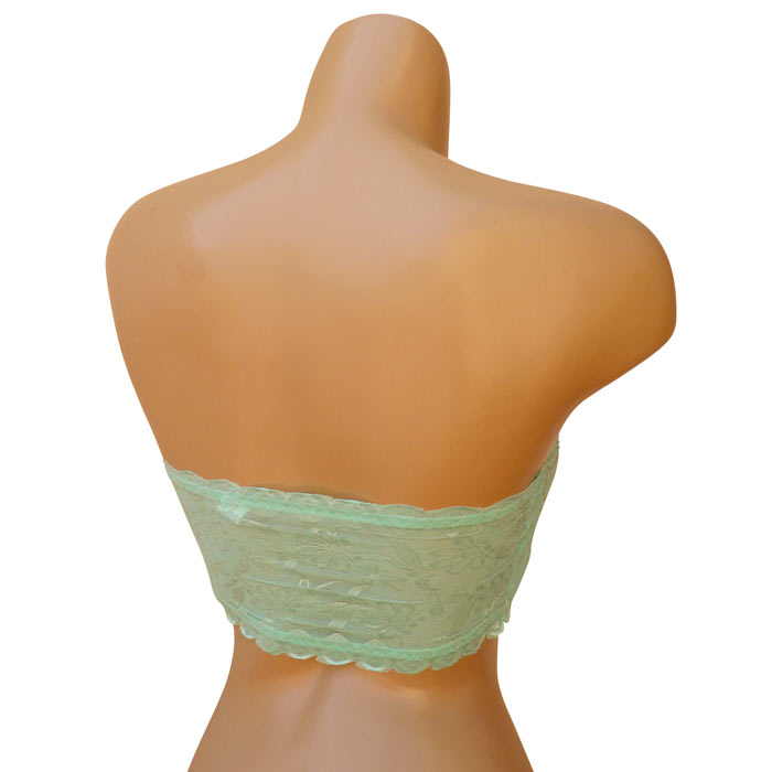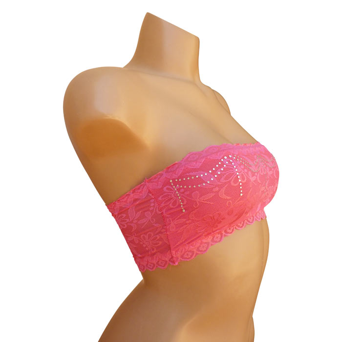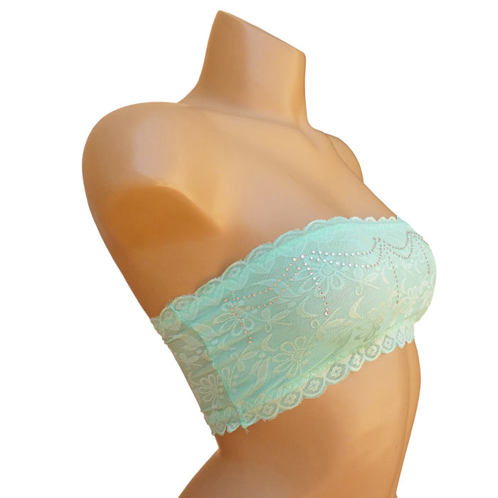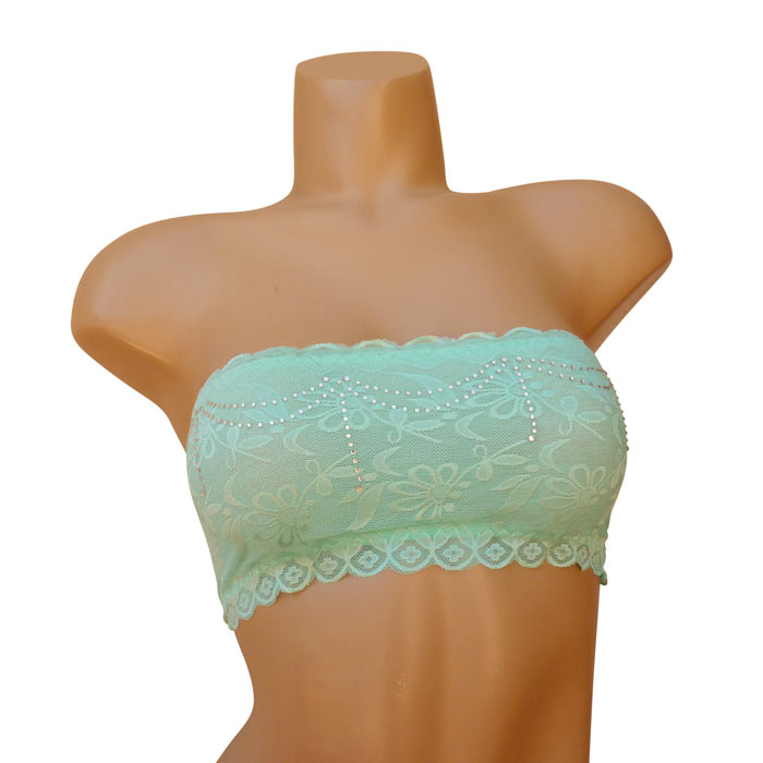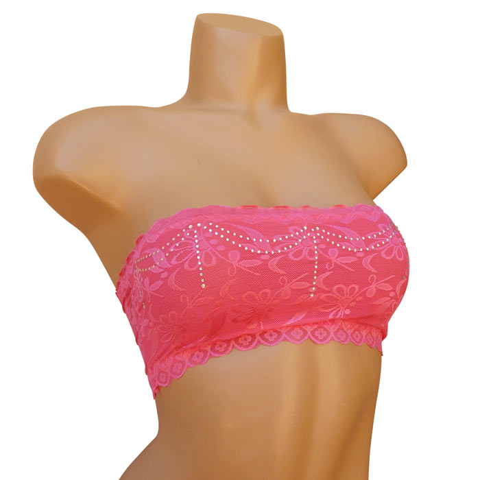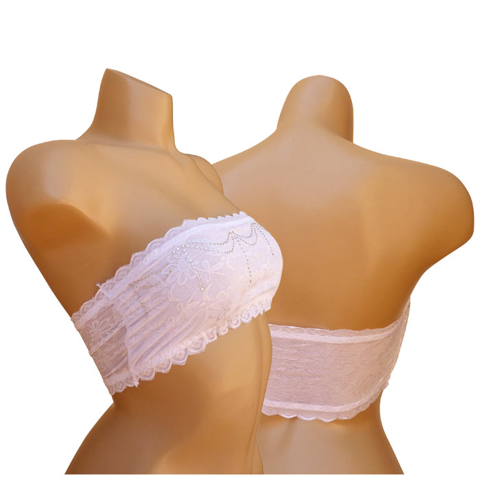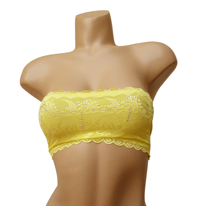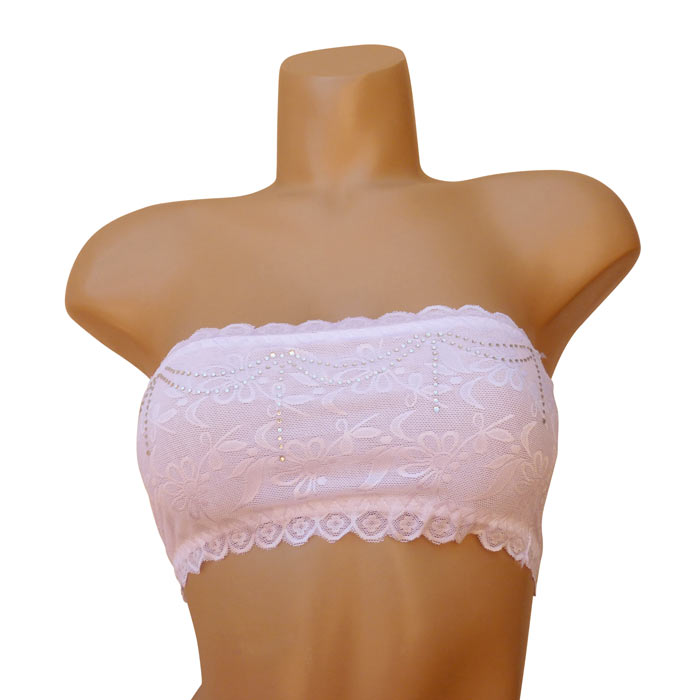 Soutien gorge bandeau non rembourré. Dentelle fleurie sur l'ensemble du bandeau. Strass sur le devant du bandeau. 2 tailles : S/M - L/XL.