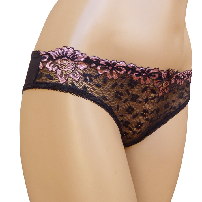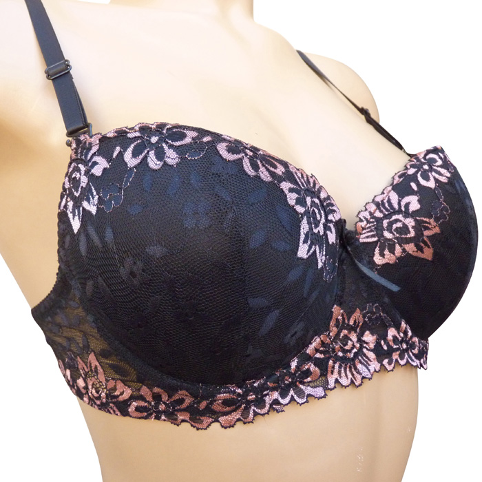 Ensemble soutien gorge avec slip. Soutien-gorge coques souples, rembourré avec armatures, bonnet C. Dentelle sur maille résille stretch sur l'ensemble des bonnets. Bandes de fleurs contrastées sur la partie supérieure et la partie inférieure du bonnet. Bretelles réglables et amovibles. Nœud satiné entre-bonnet. Fermeture doubles agrafes dans le dos et 3 positions d'accroche. Slip, rappel dentelle sur le devant, uni à l'arrière. 6 tailles : 90C au 115C. Taille européenne indiquées sur étiquette.