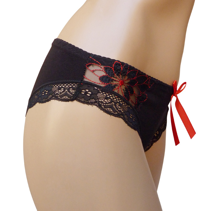 Culotte femme, coton majoritaire. Broderie contrastée de "fleurs" sur les côtés. Slip orné d'un nœud satiné contrasté sur le devant de la culotte. Bande de dentelle sur le pourtour des cuisses. Vendu par lot de 24 pièces avec 6 coloris différents. 3 tailles dans le paquet.