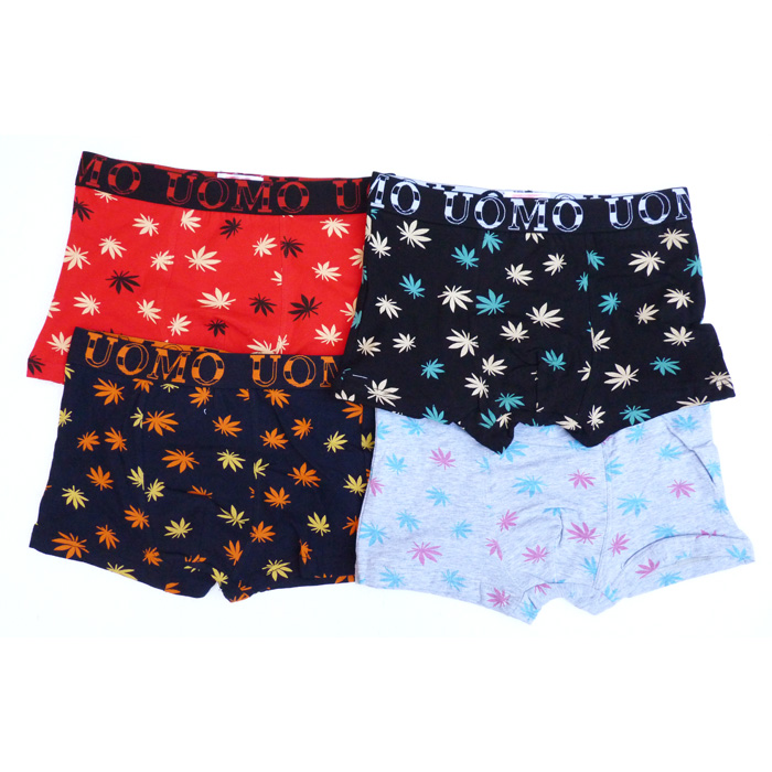 Boxer garçon, coton majoritaire. Doublé à l'avant. Boxer imprimé "feuilles colorées" sur l'ensemble du boxer. Ceinture taille gomme avec inscription. 3 Tailles : 8/10 ans - 10/12 ans -14/16 ans.