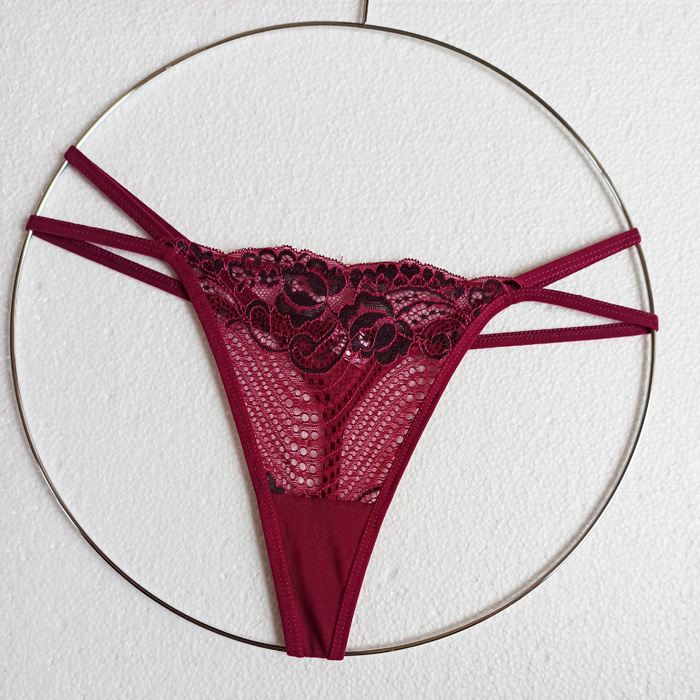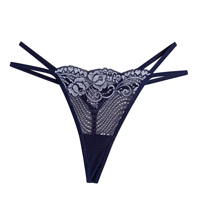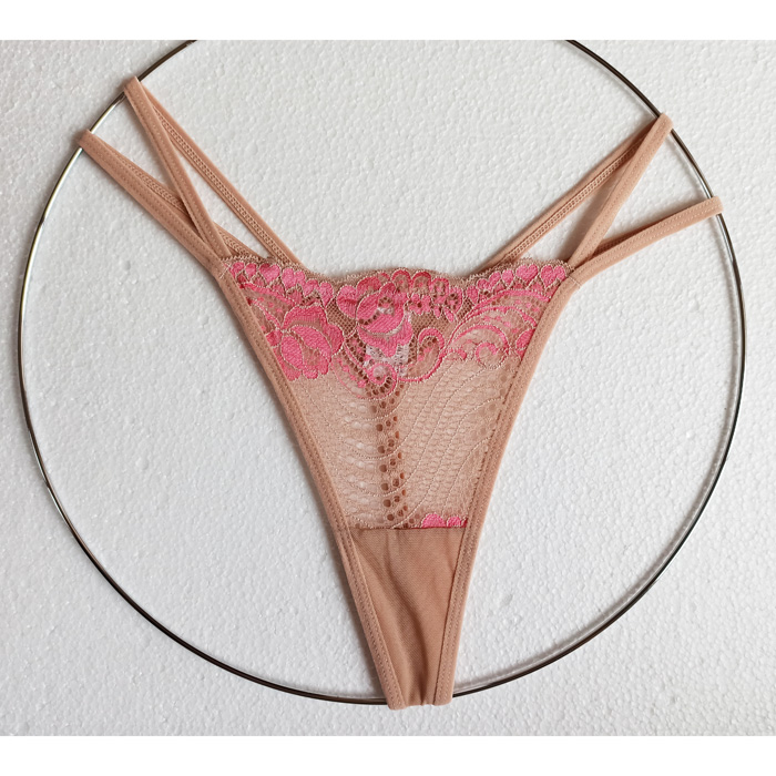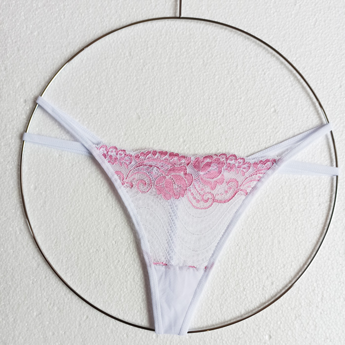 String ficelle. Broderie "fleurs" sur maille filet stretch sur le devant. Doubles brides sur les côtés. Doublé sur le fond. Taille unique. 6 coloris.