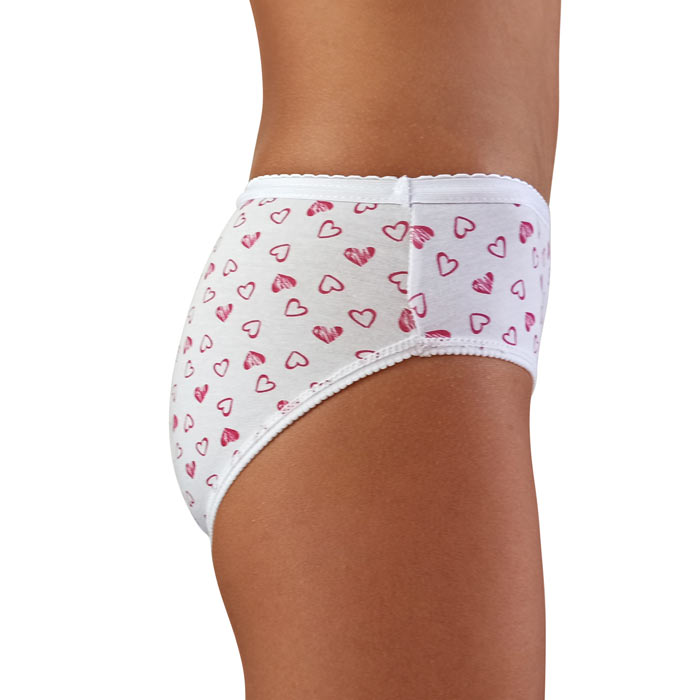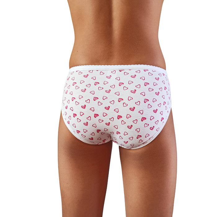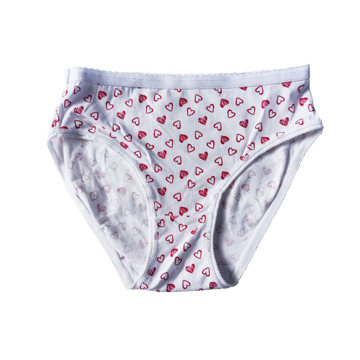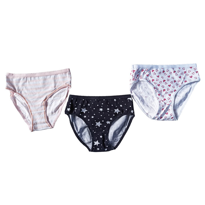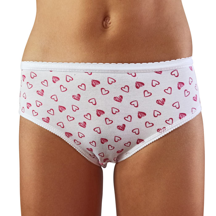 Slip fille sur fond uni imprimé "cœurs,étoiles,rayures". Culotte élastiquée à la taille.4 tailles : 4/6 ans, 6/8 ans, 8/10 ans