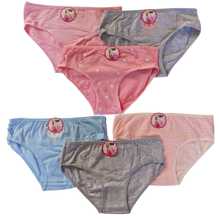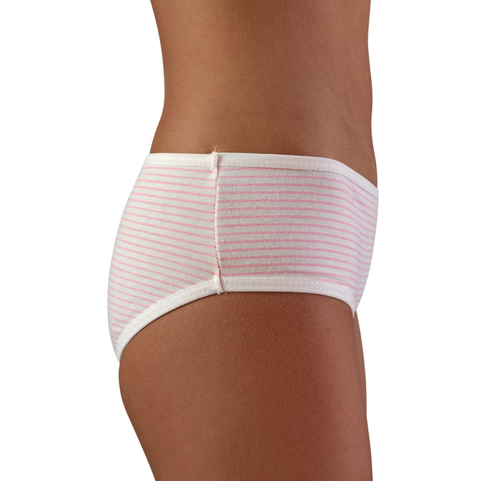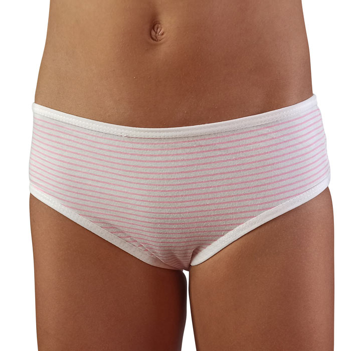Slip fille coton majoritaires sur fond uni imprimé "rayures, dessins". Culotte élastiquée à la taille. 4 tailles : 2/4 ans, 5/7 ans, 8/10 ans, 11/12 ans