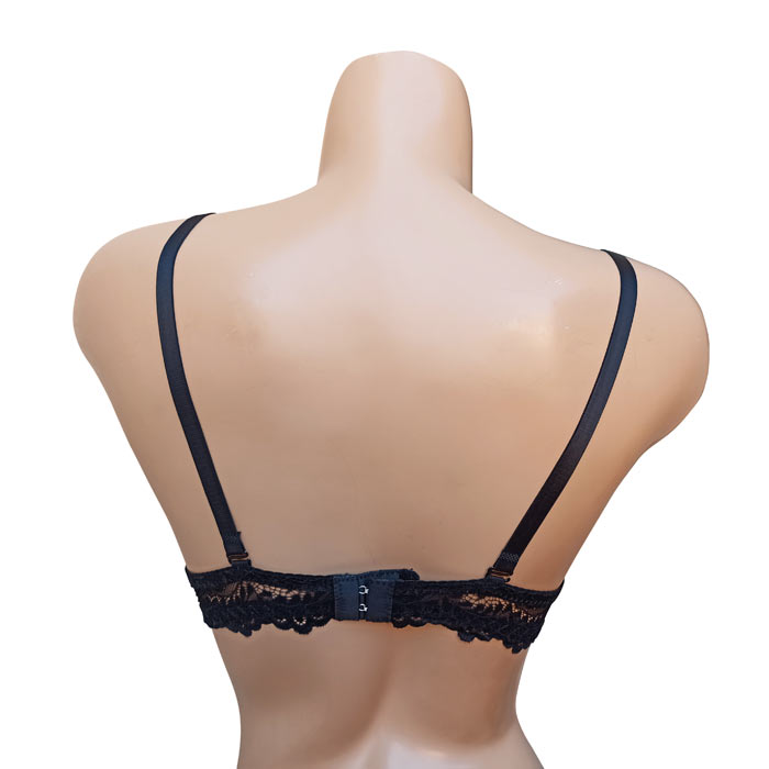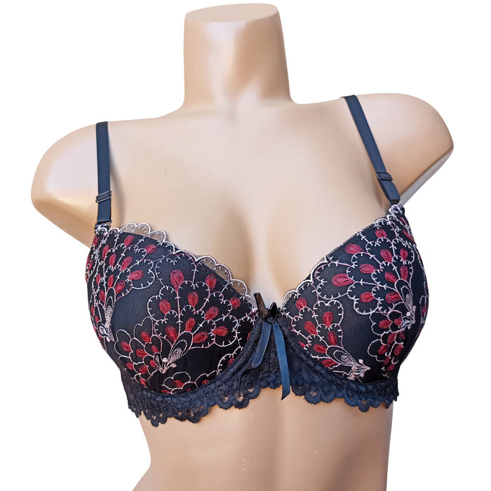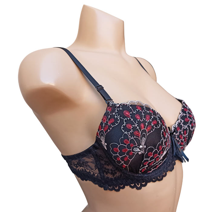 Soutien gorge avec armatures. Soutien gorge balconnet, coques souples. Motif "fleurs brodées" sur maille filet stretch. Brides réglables et amovibles. 6 Tailles. Attention : taille européenne indiquée sur étiquette.