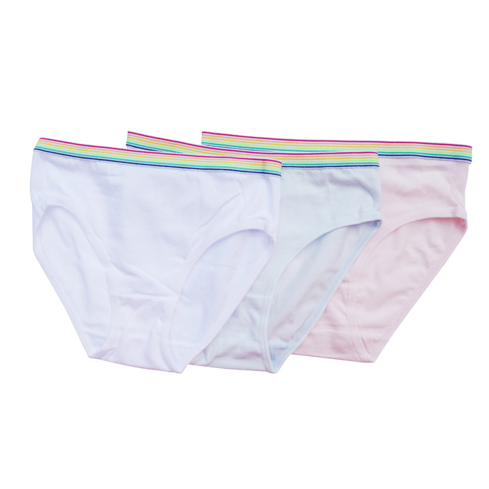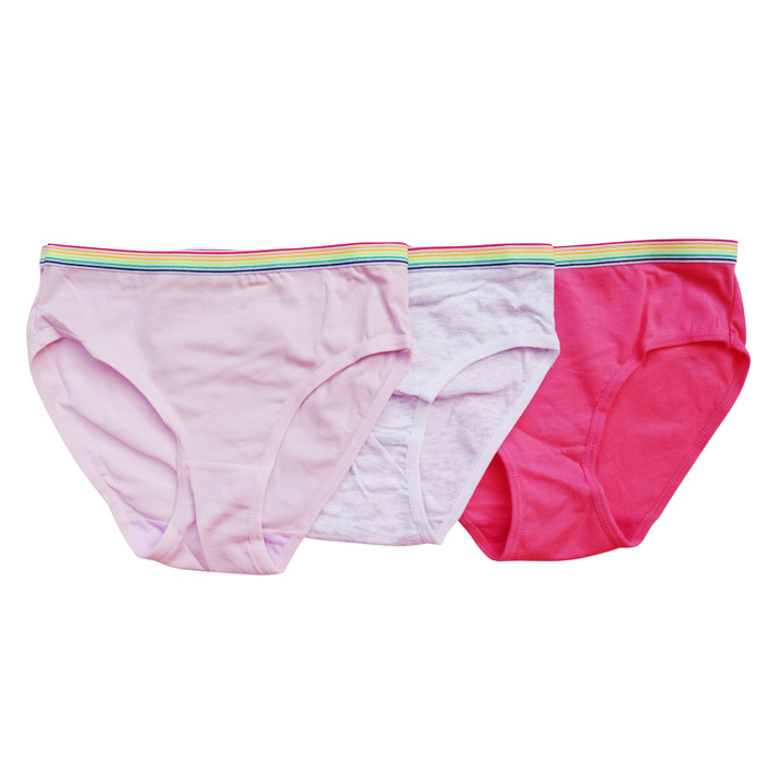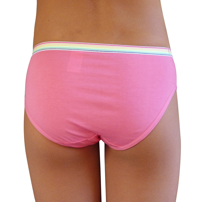 Slip fille uni. Culotte avec bande élastiquée et colorée arc-en-ciel à la taille. 4 tailles : 2/4 ans, 5/7 ans, 8/10 ans, 11/12 ans