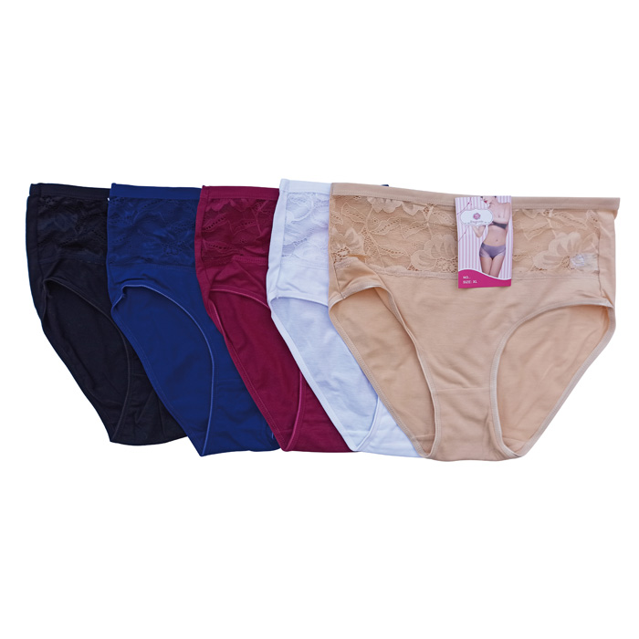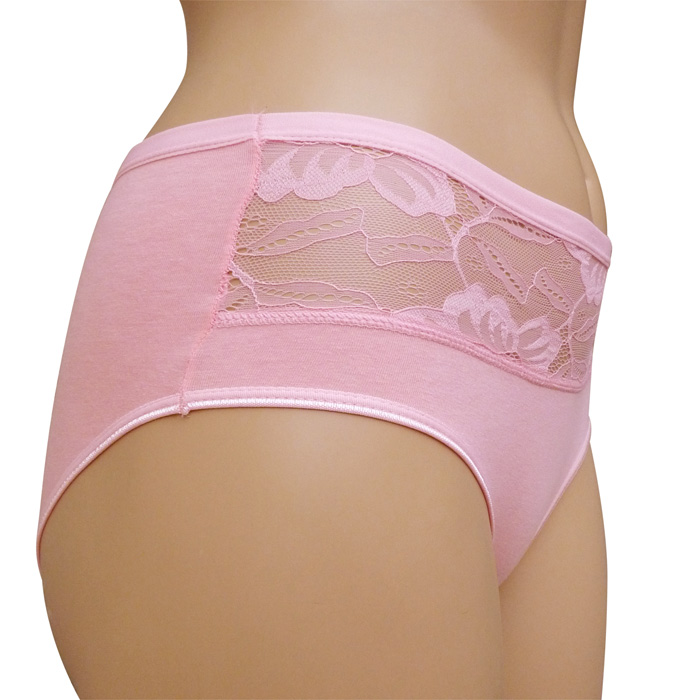 Culotte grande taille, coton majoritaire, entièrement unie. Bande large de dentelle fleurie sur maille résille stretch à la taille à l'avant. 4 tailles : L-XL-2XL-3XL