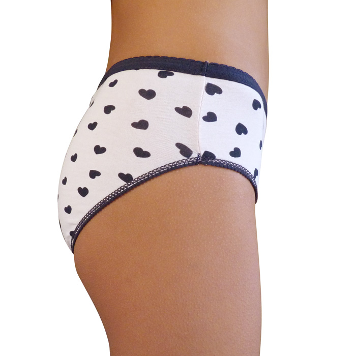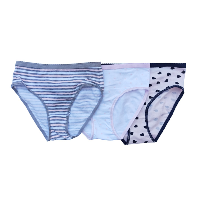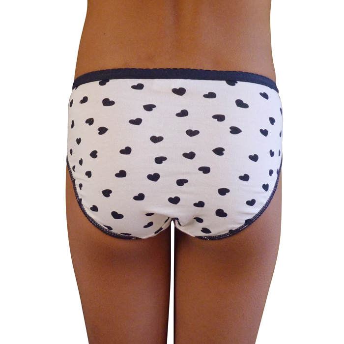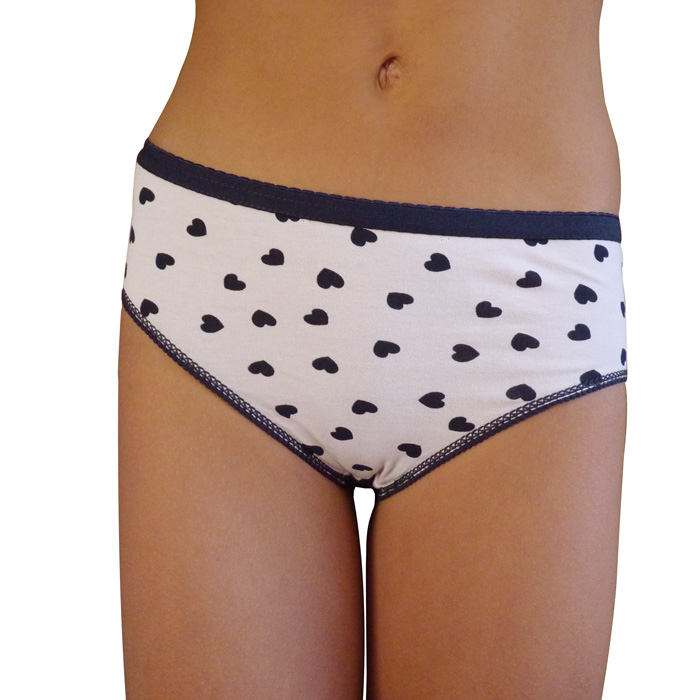 Slip fille confortable,coton majoritaires sur fond uni imprimé "rayures, cœurs". Culotte élastiquée à la taille. 4 tailles : 2/4 ans, 5/7 ans, 8/10 ans, 11/12 ans.