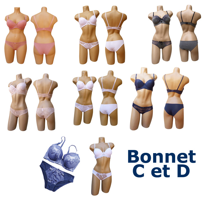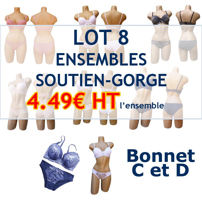 Déstockage : lot de 8 ensembles soutien-gorge avec slip. Différents modèles selon arrivage. 3 ensembles en bonnet D et 5 ensembles en bonnet C. Modèles : e1093-e1170-e1185-e1196-e1172-e1173-e1189-e1196-e1214-e1215a-e1220-e1221-e1222a-e1284