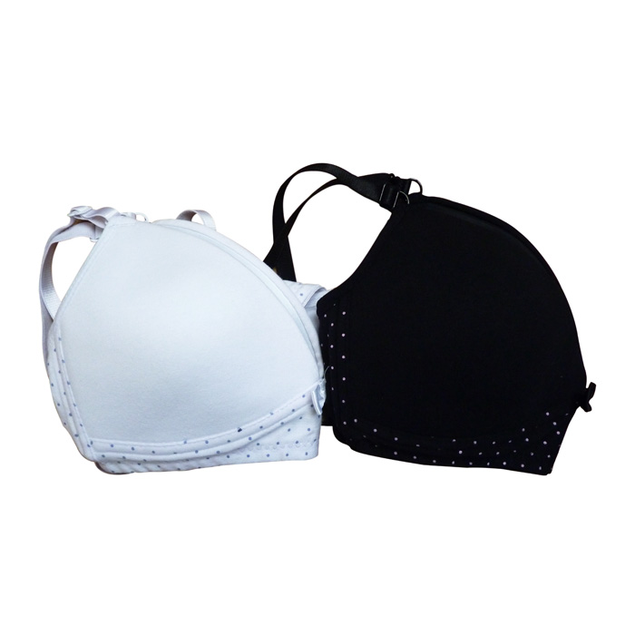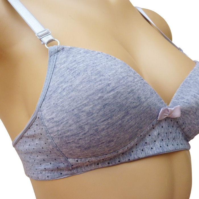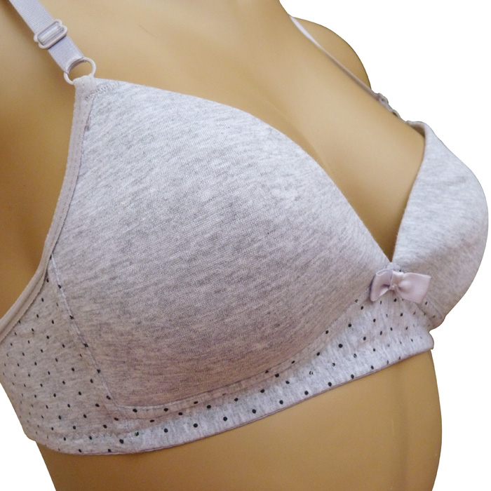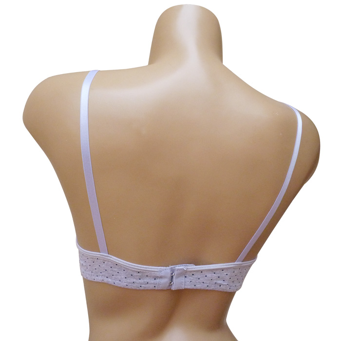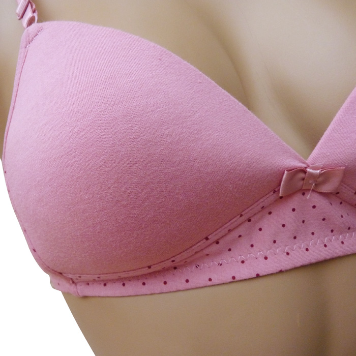 Soutien gorge petites poitrines, coton majoritaire. Soutien gorge uni avec motif "pois" sur le dessous de poitrine, bonnet A sans armatures, coques souples préformées, nœud satiné ton sur ton entre bonnet. Bonnet lisse, fermeture dos par 2 agrafes, 3 positions possibles. Brides réglables et non amovibles. 4 tailles.