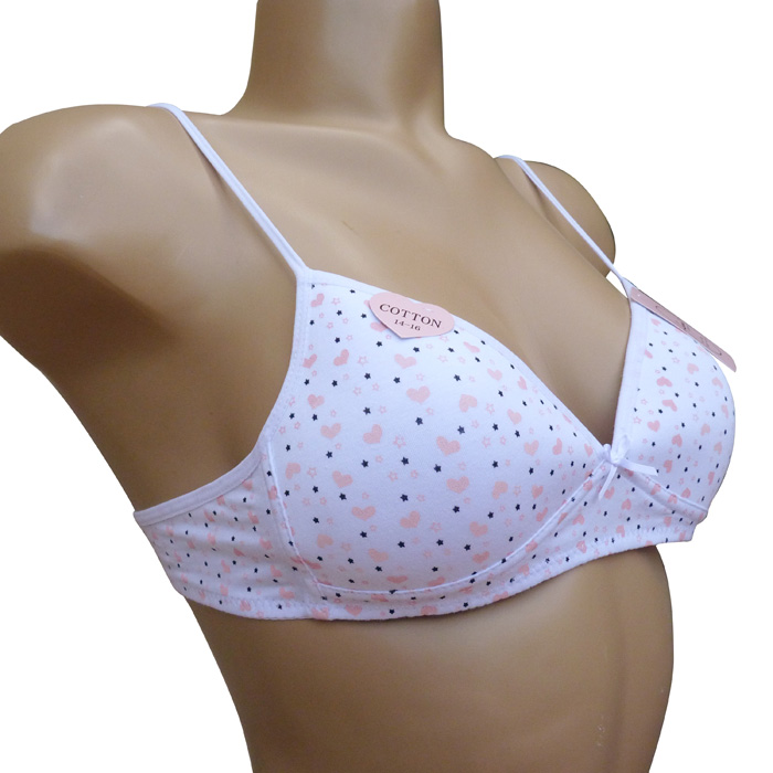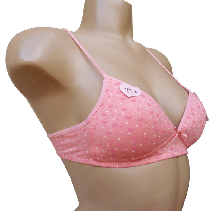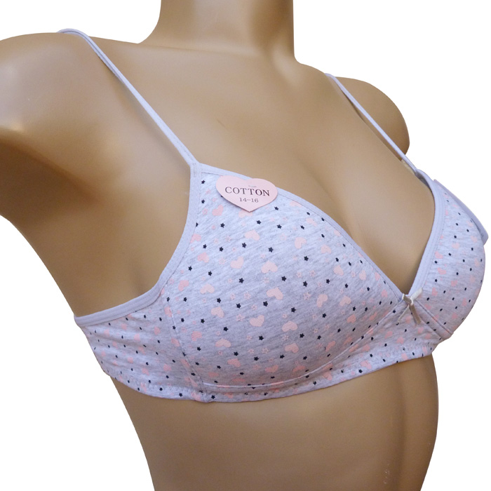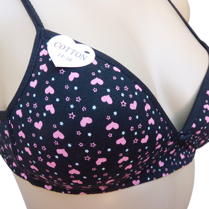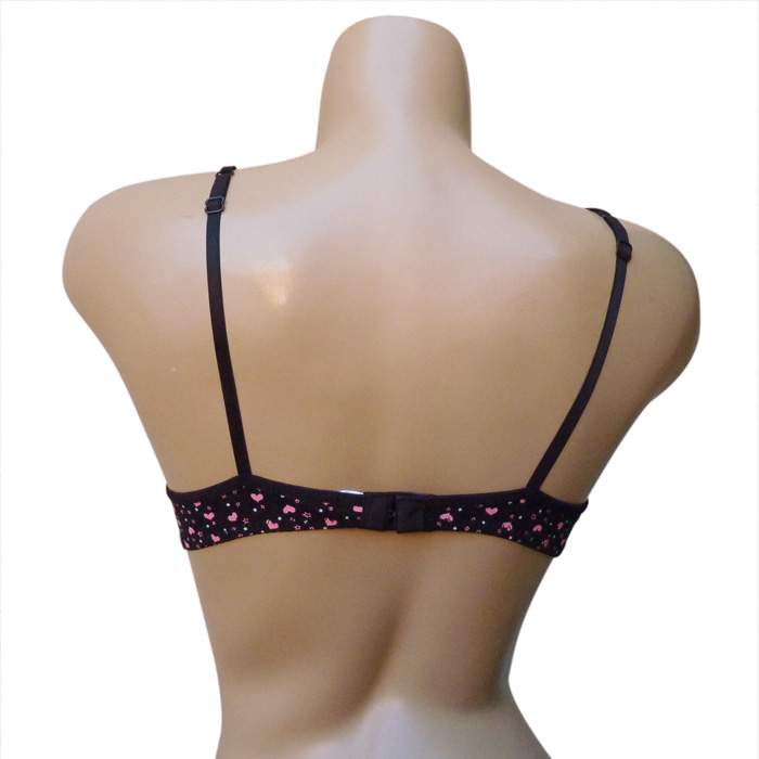 Soutien gorge petites poitrines, coton majoritaire. Soutien gorge uni avec imprimé "cœurs et fleurs" sur les bonnets.bonnet A sans armatures, coques souples préformées, nœud satiné ton sur ton entre bonnet. Bonnet lisse, fermeture dos par 2 agrafes, 3 positions possibles. Brides réglables et non amovibles. 4 tailles indiqué sur étiquette :