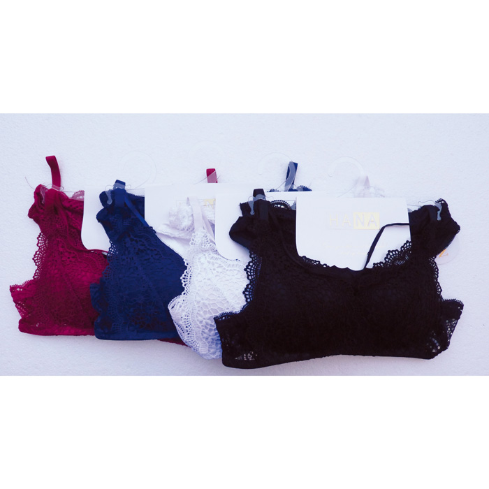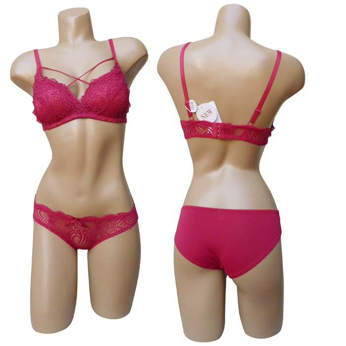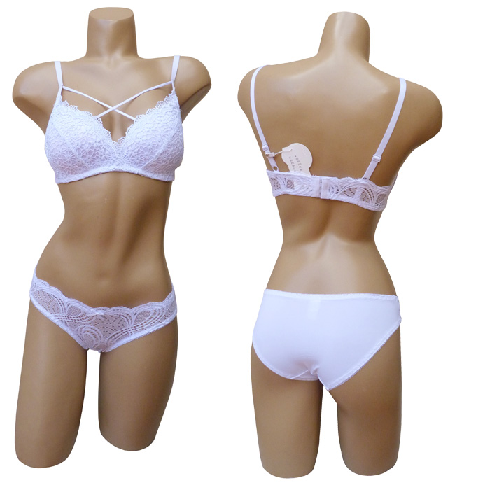 Ensemble soutien gorge avec slip. Soutien gorge rembourré coques souples sans armatures, bonnet B. Dentelle "fleurs" sur les bonnets, brides sur le devant du soutien gorge. Nœud satiné entre-bonnet. Brides réglables et non amovibles. Dos en dentelle, fermeture 3 agrafes, 3 positions d'accroches. Culotte microfibre avec dentelle sur le devant, uni l'arrière. 6 tailles : 80B au 105B.