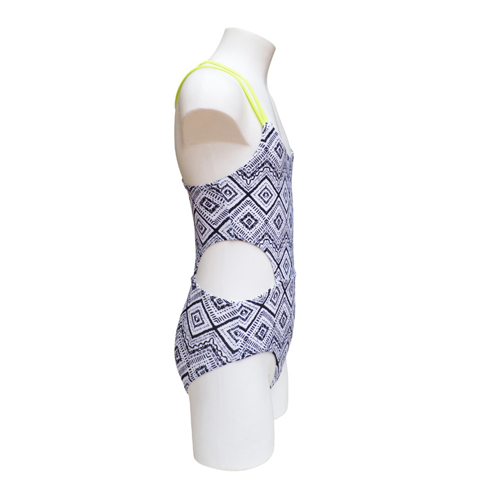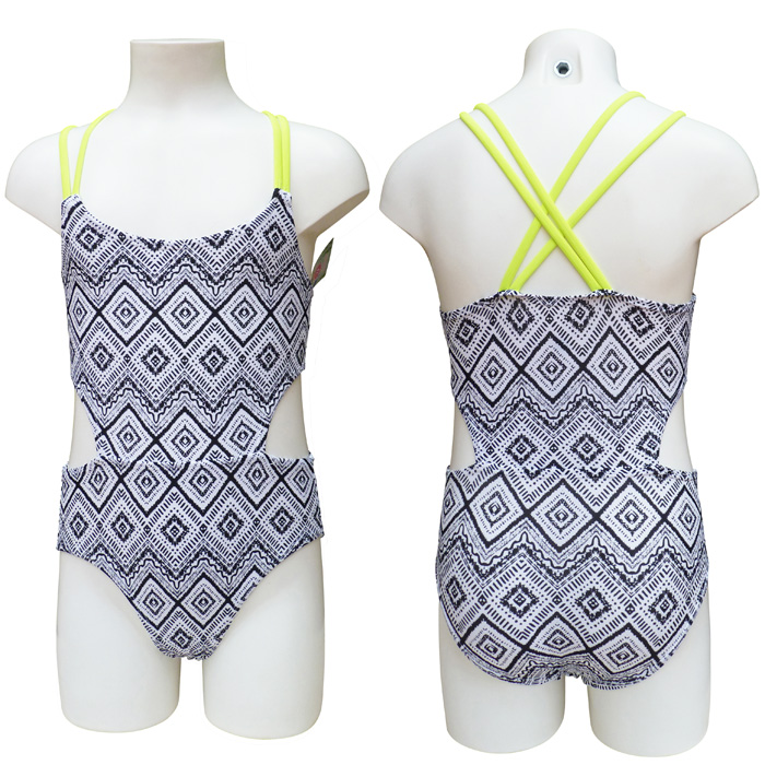 Maillot de bain fille,1 pièce doublé à l'avant, maillot type trikini. Imprimé graphique". Double brides jaune fluo, croisé dans le dos. 4 tailles : 4/6 -6/8 ans- 10/12 ans - 12/14 ans