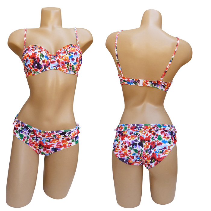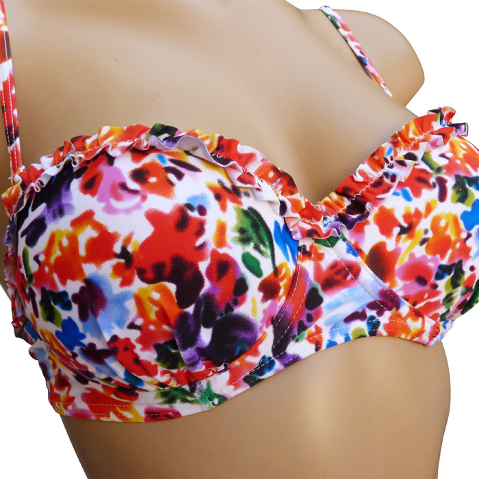 Maillot de bain 2 pièces avec slip. Soutien gorge forme bandeau avec armatures. Soutien gorge bretelles réglables et amovibles, se clipse au dos. Imprimé "fleurs colorées" sur l'ensemble du maillot. Bas du maillot entièrement doublé avec rappel imprimé, mini volant sur le pourtour de la taille. 5 tailles. Taille européenne indiquée sur étiquette.