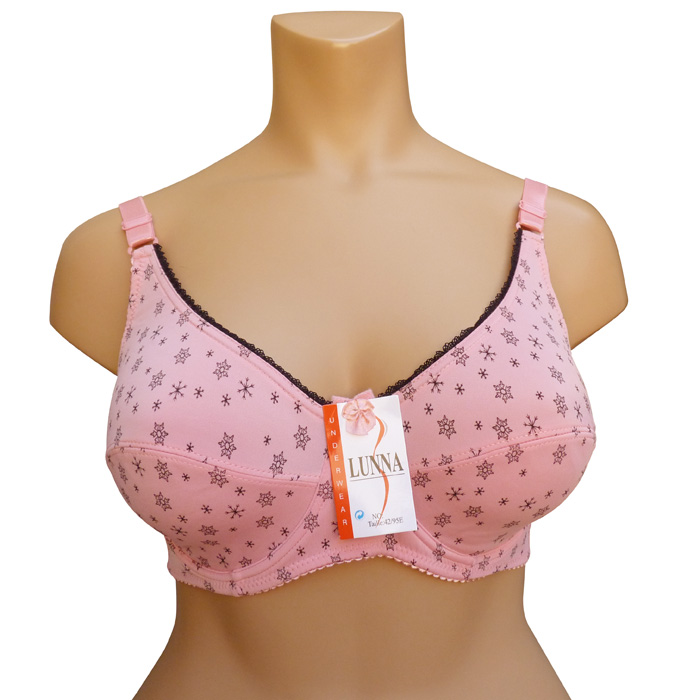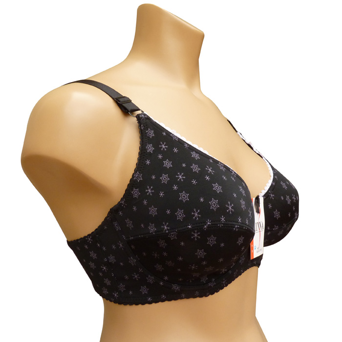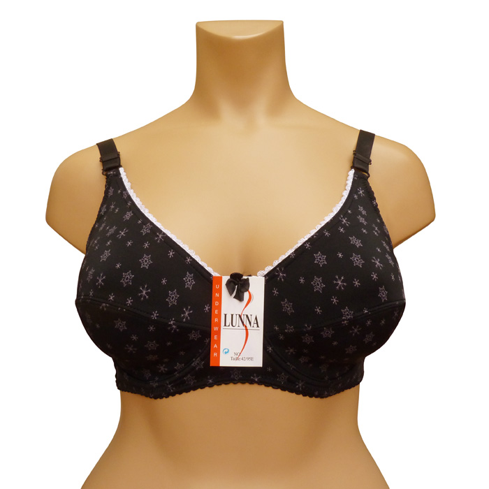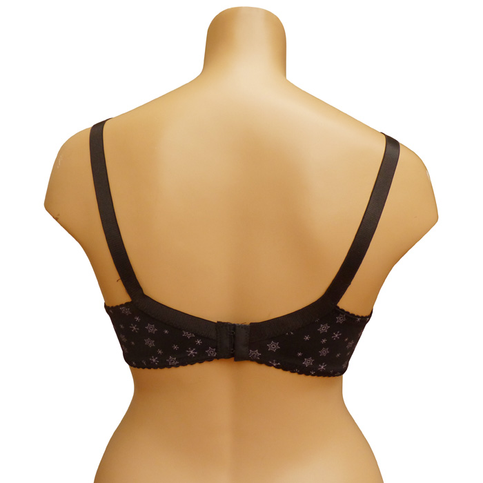 Soutien gorge grande taille bonnet E, non rembourré avec armatures. Tissu extensible et confortable, Imprimé étoiles noires sur l'ensemble du soutien gorge. Soutien gorge dentelé sur la partie supérieure. Bretelle règlables, non amovibles. Fermeture dos 2 agrafes, 3 positions d'accroche. 6 tailles : 95E au 120E.