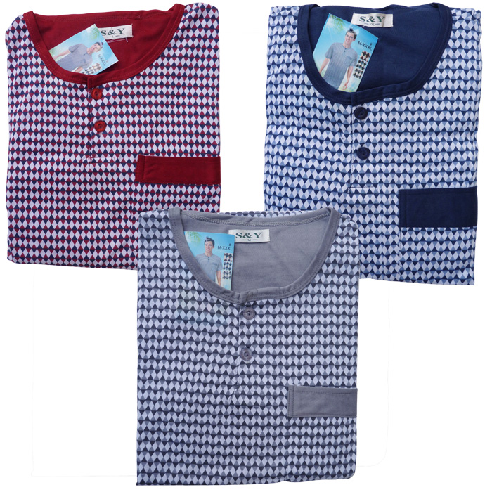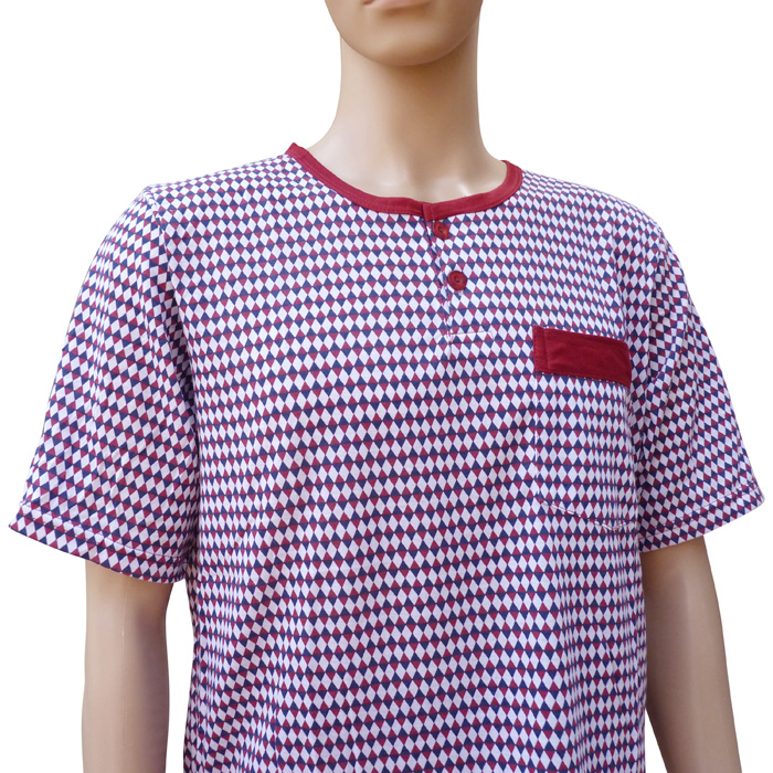 Pyjashort homme. Tunique manches courtes. Col rond bordé d'un liseré contrasté avec fermeture 3 boutons sur le col. Imprimé "losanges bicolores" sur l'ensemble du tee-shirt avec poche sur un côté. Short de couleur uni, taille élastiquée. 5 tailles 3 couleurs.