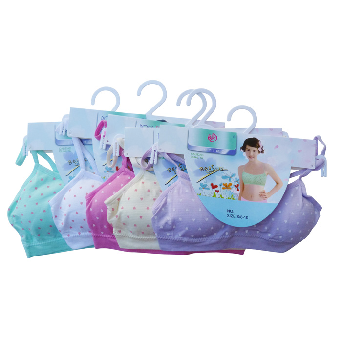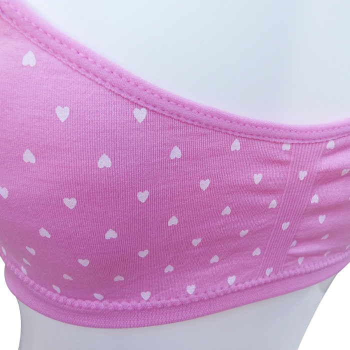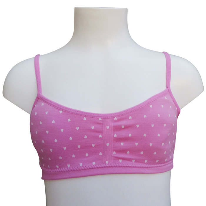 Brassière enfant confortable en microfibre Lycra tons pastels. Brassière imprimé "cœurs" sans armatures. Petites mousses amovibles. Fines brides montantes sur épaules. Bande stretch sous poitrine . 6 coloris différents. 3 Tailles : 8/10 ans, 10/12 ans et 12/14 ans.