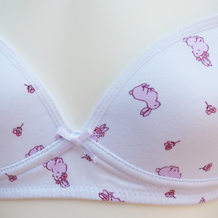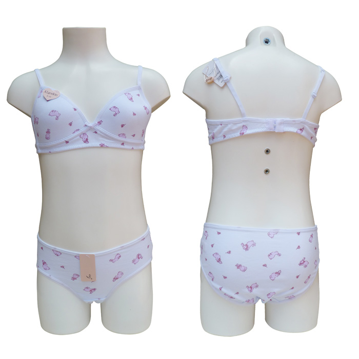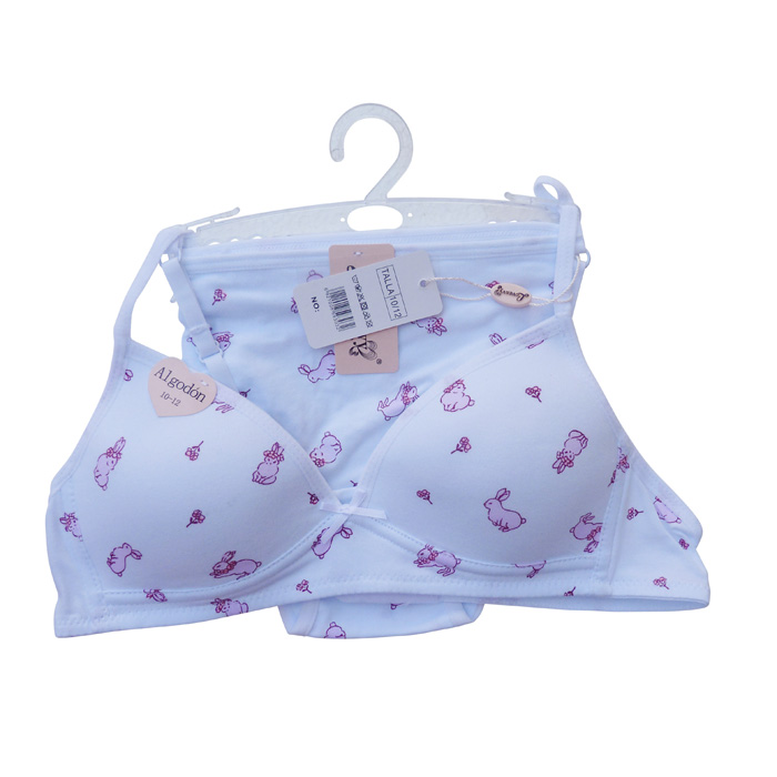 Ensemble soutien gorge, coton majoritaire, petite taille avec slip, première poitrine. Soutien gorge sans armatures. Imprimé "lapins rose" sur l'ensemble du soutien-gorge. Nœud satin entre bonnets. Bretelles réglables et non amovibles. 1 agrafe dans le dos avec 3 positions d'accroches. Culotte avec rappel motif "lapins", élastiquée à la taille. 4 tailles : 8/10 ans (x1) - 10/12 ans (x2) - 12/14 ans (x2) - 14/16 ans (x1).
