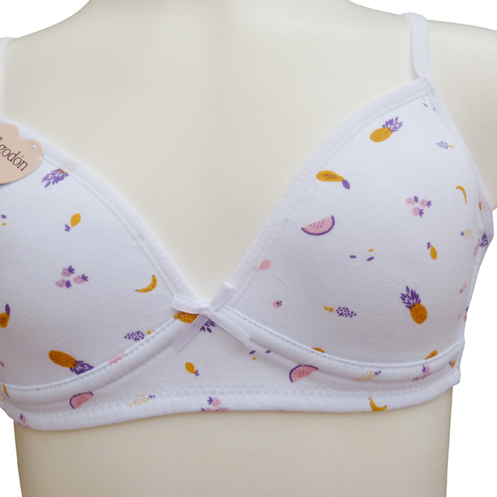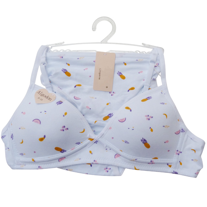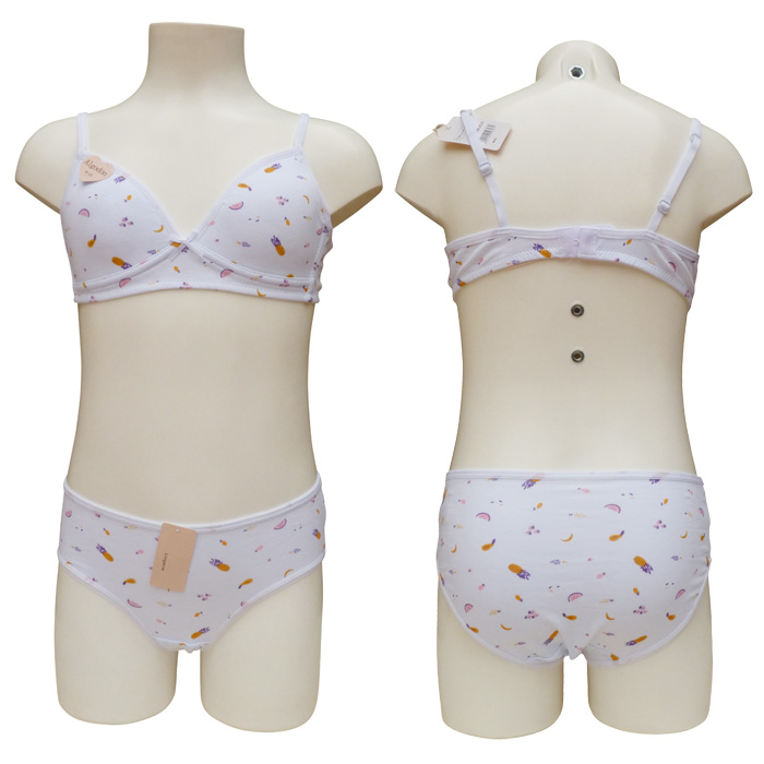 Ensemble soutien gorge, coton majoritaire, petite taille avec slip, première poitrine. Soutien gorge sans armatures. Imprimé "fruits, ananas orange et violet" sur l'ensemble du soutien-gorge. Nœud satin entre bonnets. Bretelles réglables et non amovibles. 1 agrafe dans le dos avec 3 positions d'accroches. Culotte avec rappel motif "fruits", élastiquée à la taille. 4 tailles : 8/10 ans (x1) - 10/12 ans (x2) - 12/14 ans (x2) - 14/16 ans (x1).