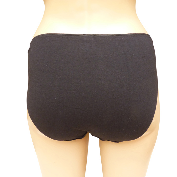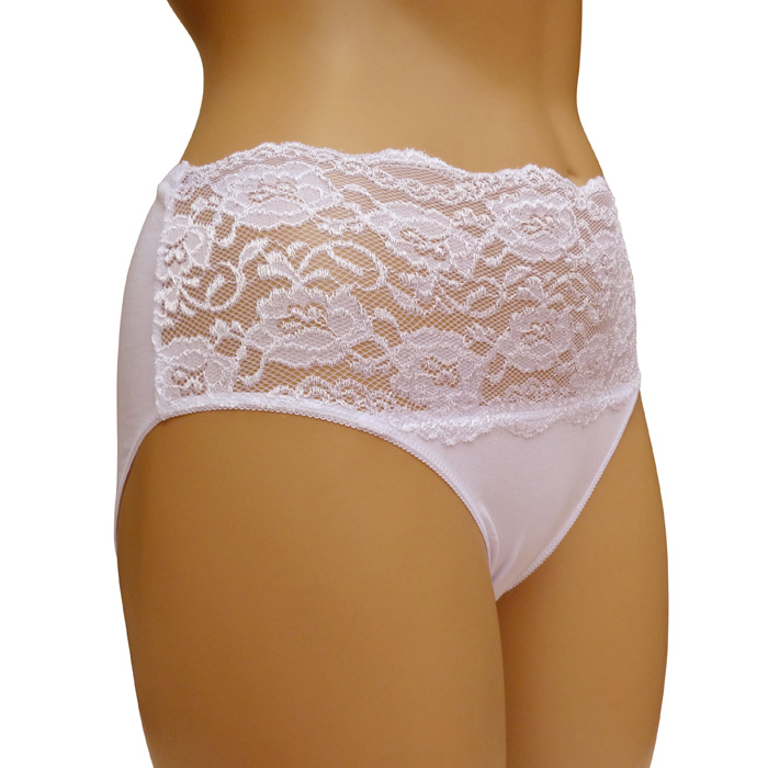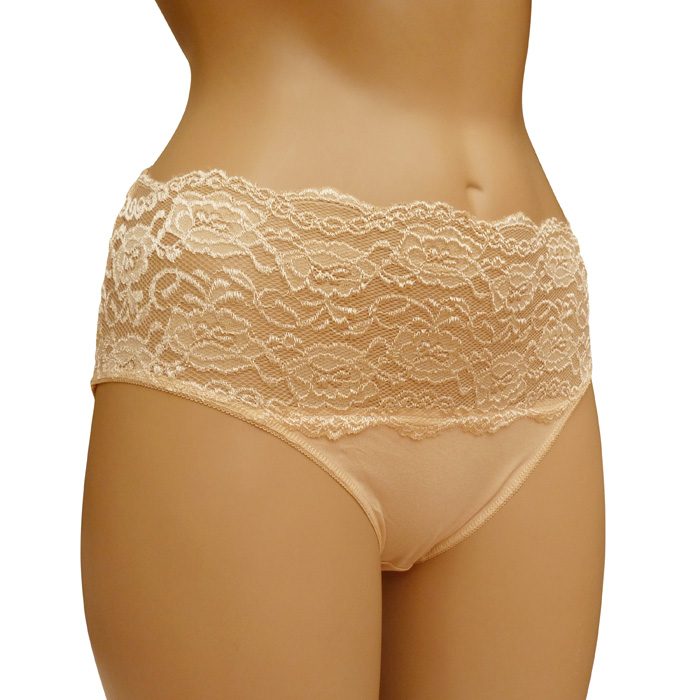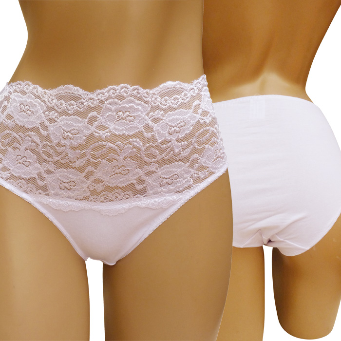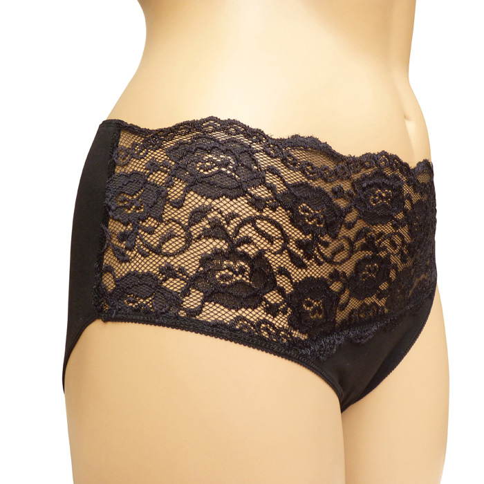Culotte grande taille, coton majoritaire . Large bande (environ 12 cm) de dentelle fleurie sur maille résille stretch à la taille à l'avant, unie à l'arrière. 4 tailles indiquées sur étiquette.