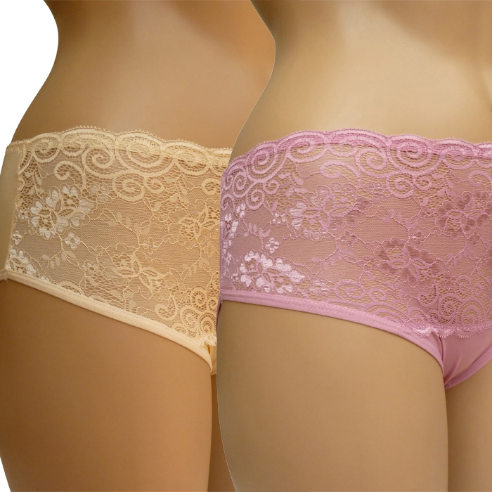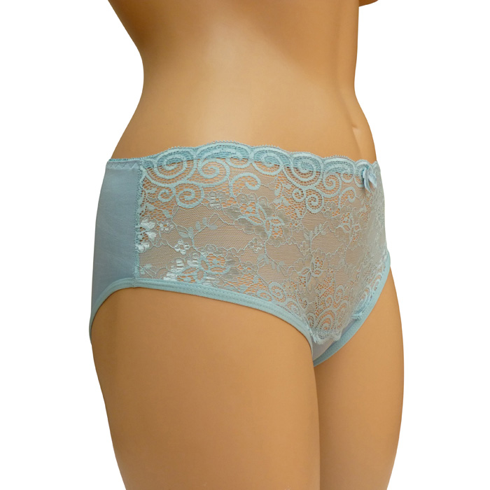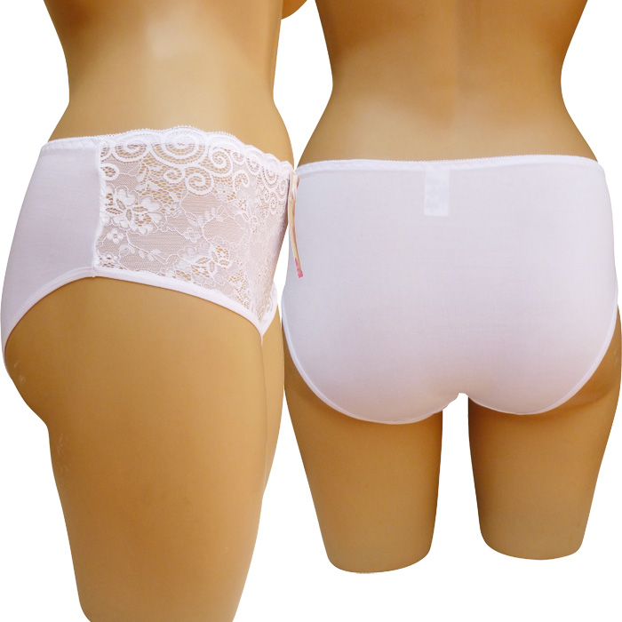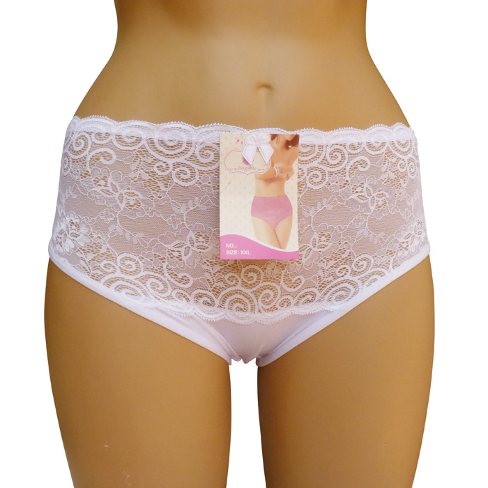 Culotte grande taille. Large bande de dentelle fleurie sur maille résille stretch à la taille sur le devant du slip, uni à l'arrière. Élastiquée à la taille. 4 tailles indiquées sur étiquette.