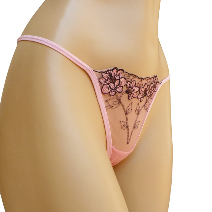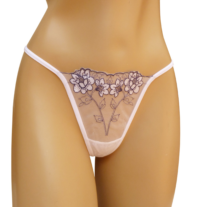 String ficelle. Broderie "fleurs" sur maille filet stretch sur le devant. Doublé sur le fond. Taille unique.