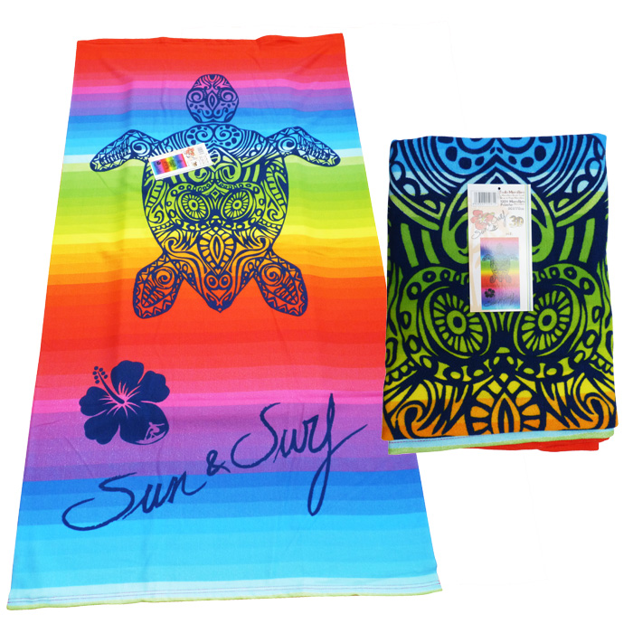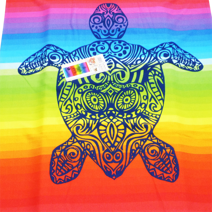 Grande serviette de plage en microfibre. Motif "tortue" sur fond multicolore. Dimension : 90x170.