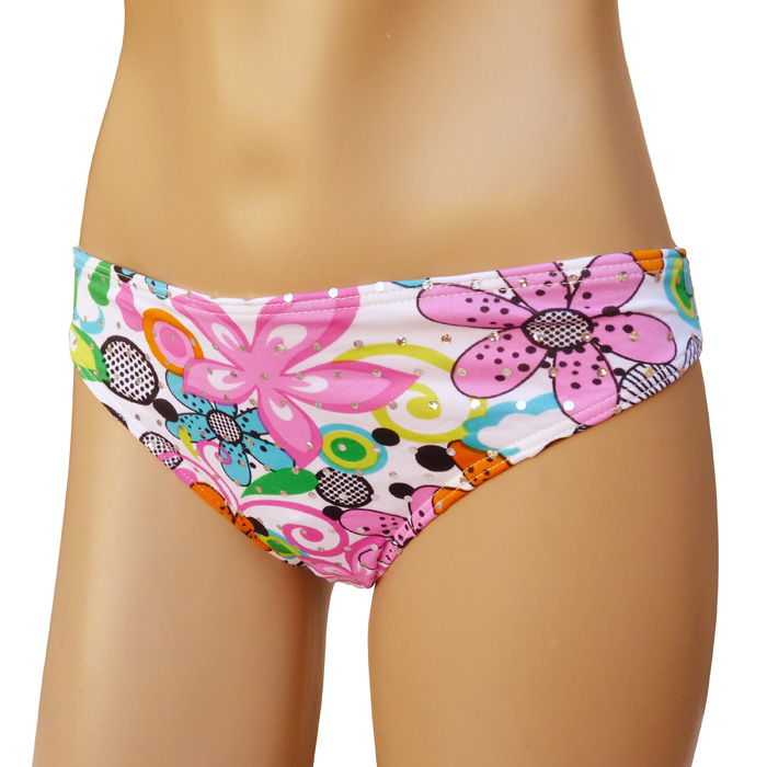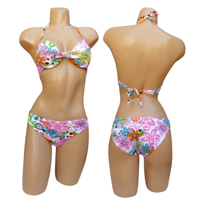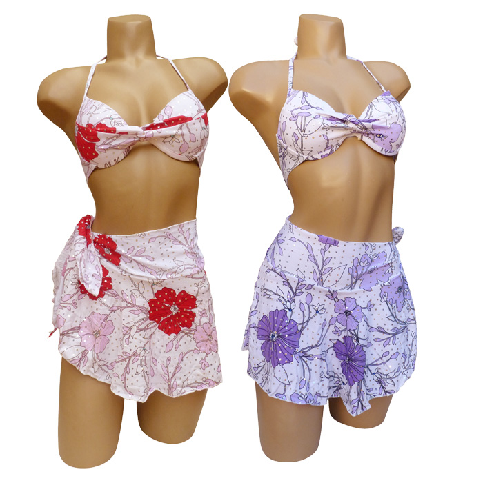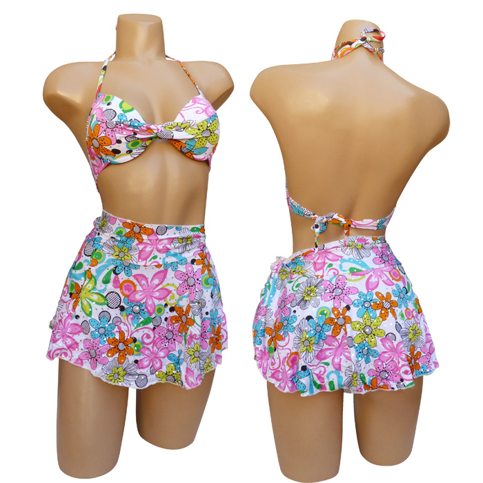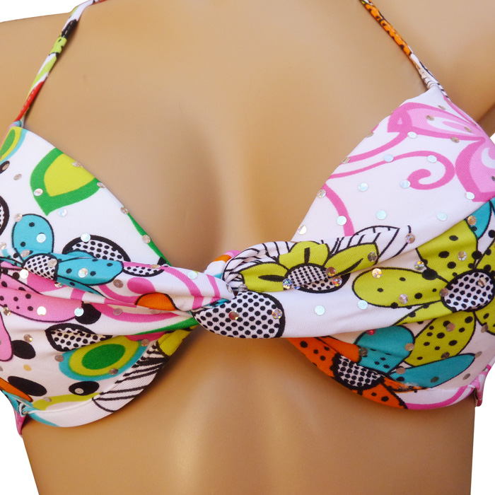 Maillot de bain 2 pièces avec jupette ou paréo. Soutien gorge forme bandeau, avec armatures. Se noue autour du cou et dans le dos. Imprimé "Fleurs" multicolore sur le soutien gorge avec paillettes. Slip doublé à l'avant, imprimé "fleurs". Jupette ou paréo avec rappel imprimé "fleurs". 3 tailles.