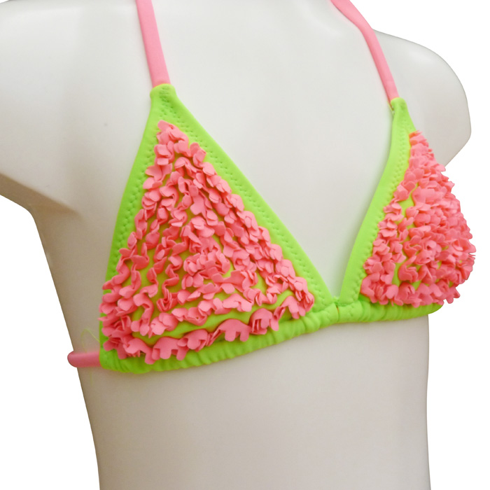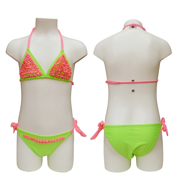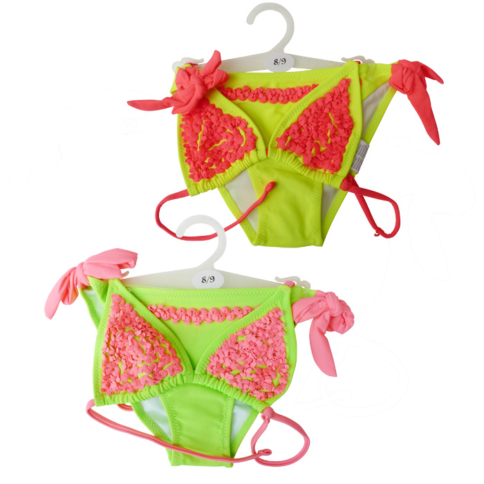 Maillot de bain fille bicolore,2 pièces, haut du maillot, soutien-gorge forme triangle, Brides réglables dans le dos. Taille ajustable au cou. Maillot uni avec "fleurs" sur le soutien-gorge. Slip entièrement doublé avec attaches sur les côtés du maillot. 5tailles : 6/7 ans- 8/9 ans - 10/11 ans - 12/13 ans - 14/15 ans