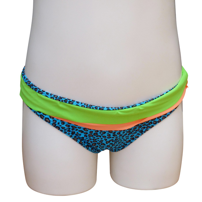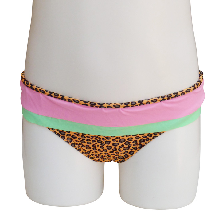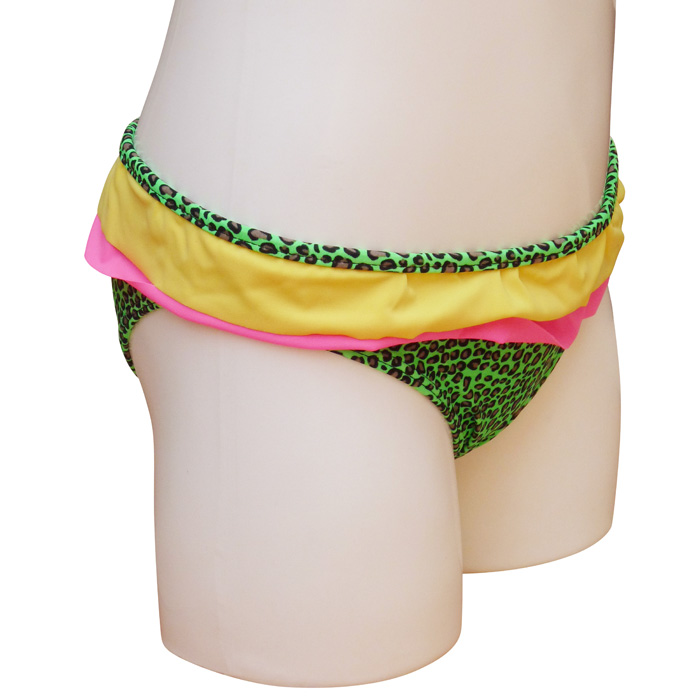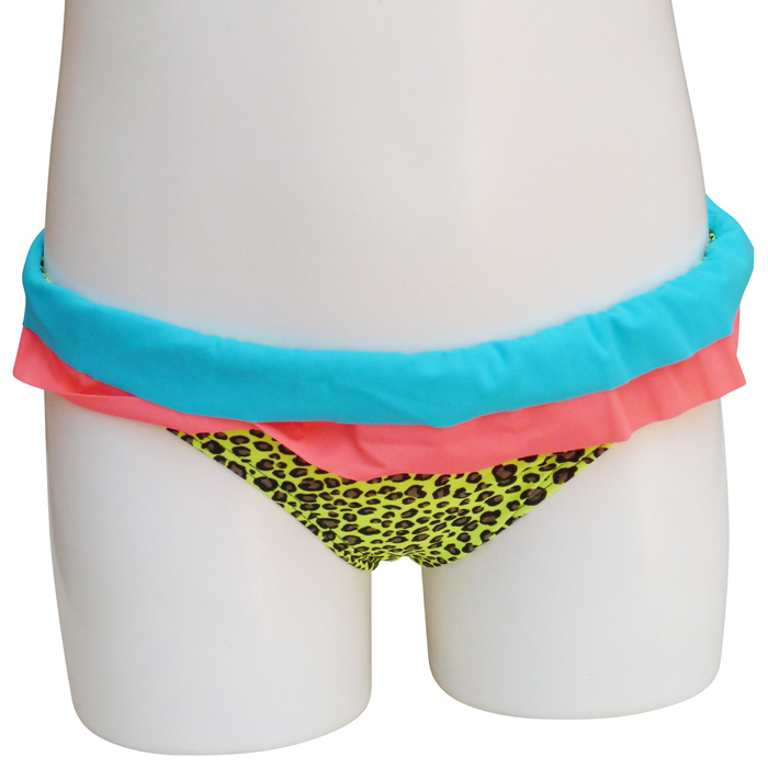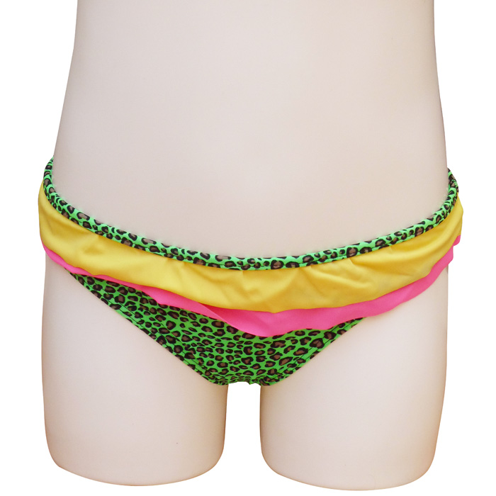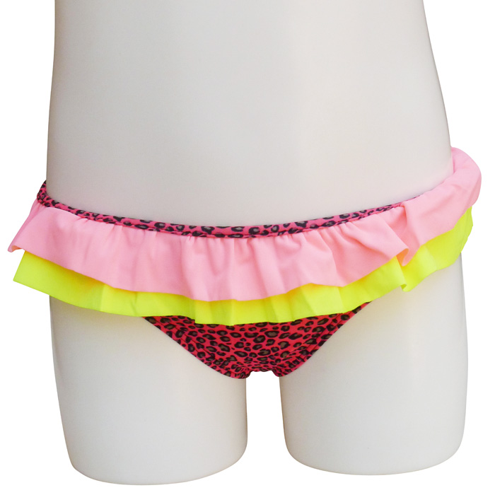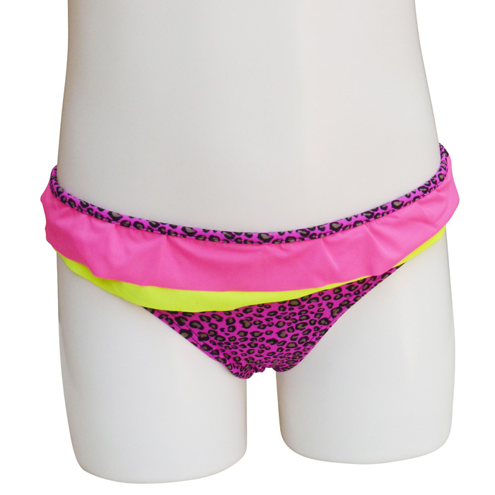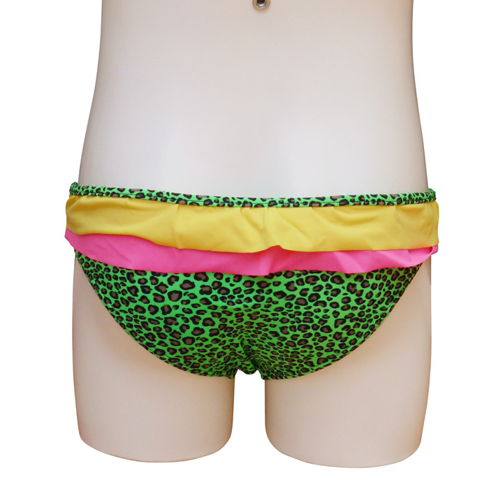 Slip de bain bébé fille tricolore,1 pièce, Maillot motif "léopard" avec 2 volants sur le pourtour de la taille. Slip élastiqué à la taille, entièrement doublé.