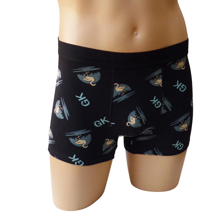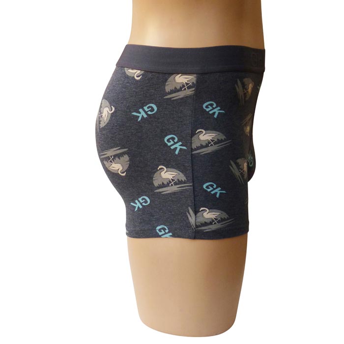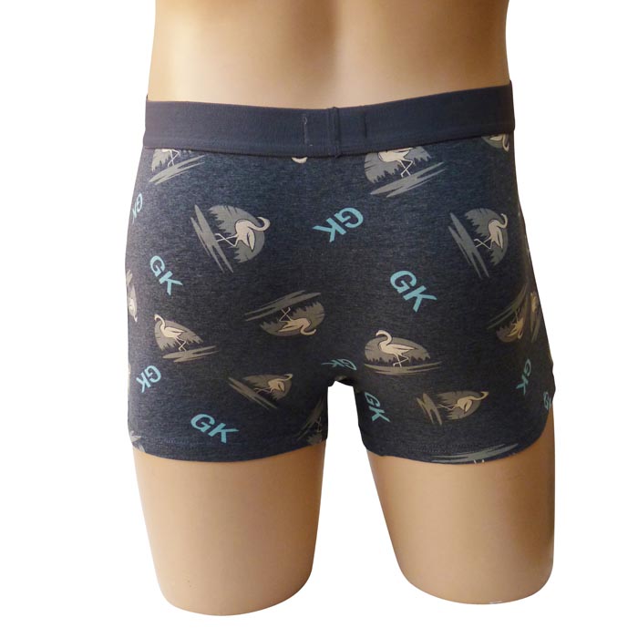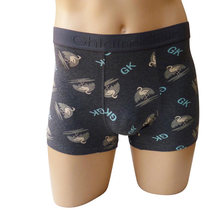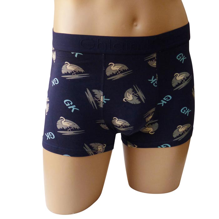 Boxer homme, coton majoritaire. Tissu imprimé avec des motifs "flamants" et inscriptions "GK" sur l'ensemble. Boxer doublé à l'avant. Ceinture élastiquée avec inscription "Ghlain Klain " à l'avant. 4 tailles : M-L-XL-XXL.
