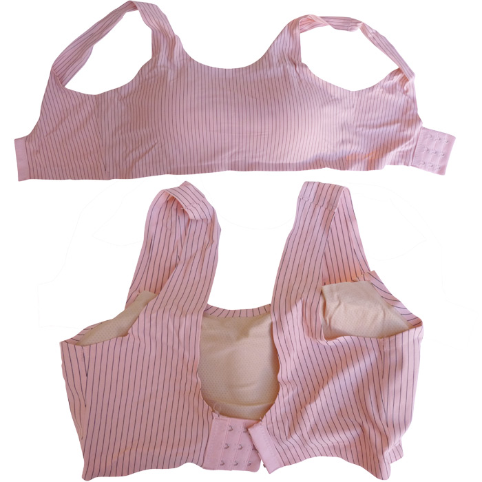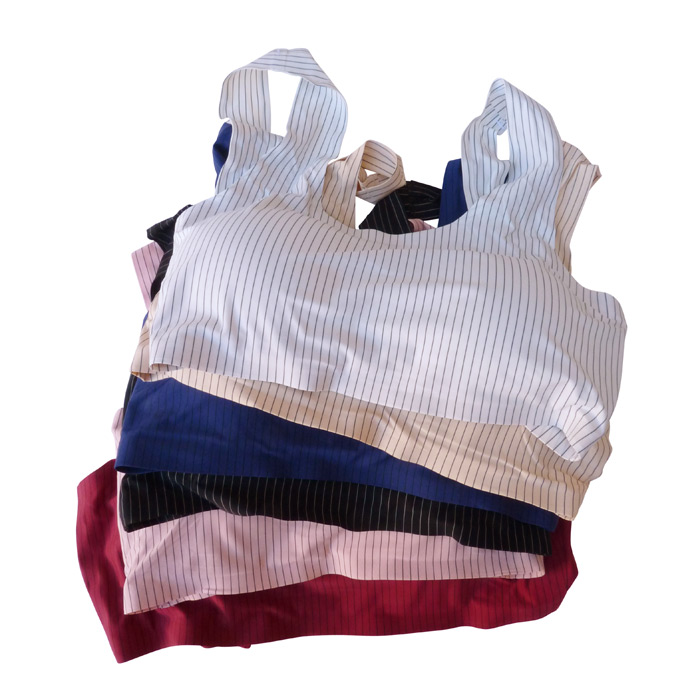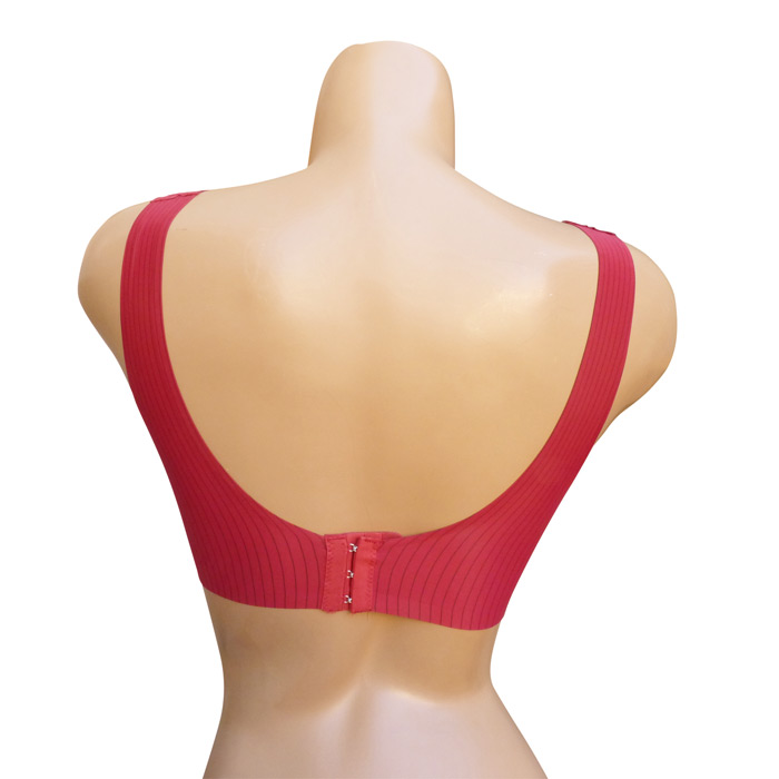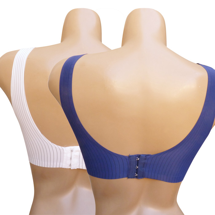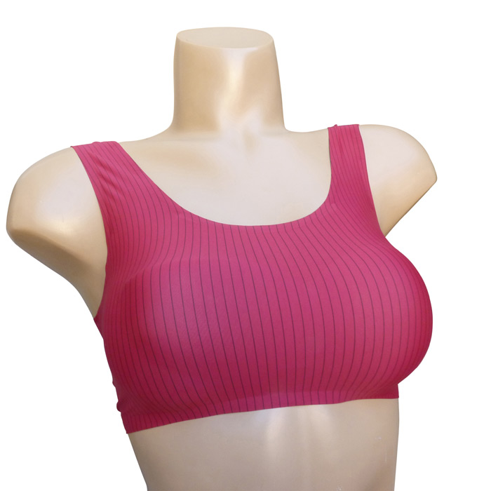 Soutien-gorge brassière. Bonnets sans armatures, sans coques avec coussinets amovibles. Matière douce et extensibles. Brassière unie, rayures verticales contrastées. Larges brides montantes sur épaules. Fermetures dos triples agrafes et 3 positions d'accroches. 6 coloris dans le paquet. Taille unique.
