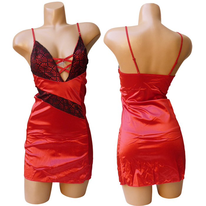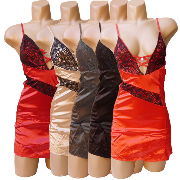Nuisette satin stretch avec string. Soutien gorge plongeant forme triangle avec laçage ajouré entre bonnet. Fleurs brodées sur sur maille résille stretch au niveau des bonnets. Bretelles réglables. 5 coloris différents. Taille unique.