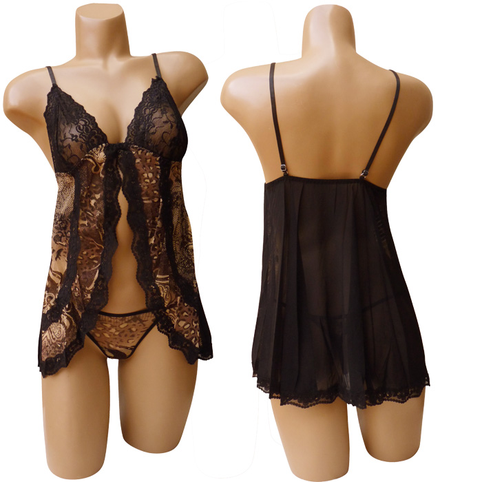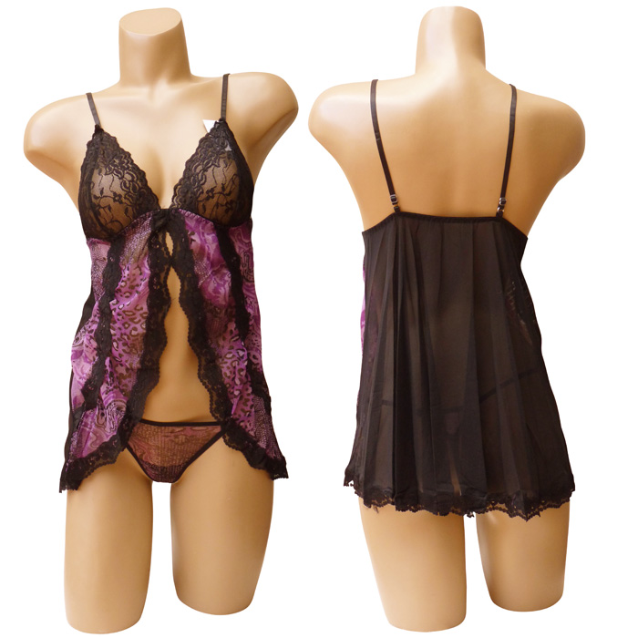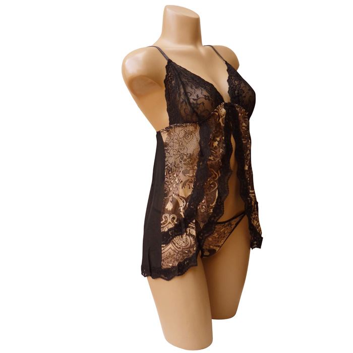 Nuisette ouverte voile stretch avec string. Broderie sur maille filet stretch, fil brillant. Forme évasée, bordure dentelée sur le pourtour. Bretelles réglables, dos élastiquée. String voile stretch avec broderie, rappel fil brillant. 2 tailles: S/M et L/XL
