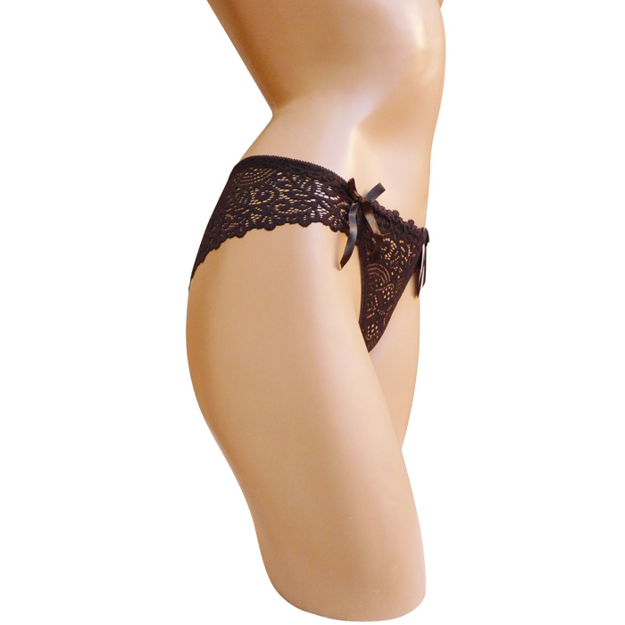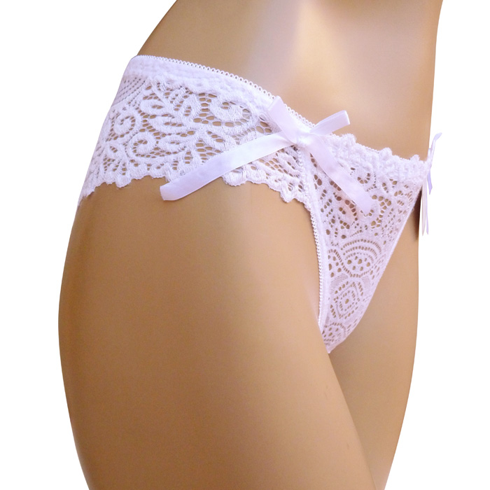 Culotte femme tout en dentelle devant et derrière. Fleurs brodées sur maille filet stretch. Nœuds satinés ton sur ton sur les côtés. Doublé sur le fond. Culotte extensible. 3 tailles : M, L et XL.