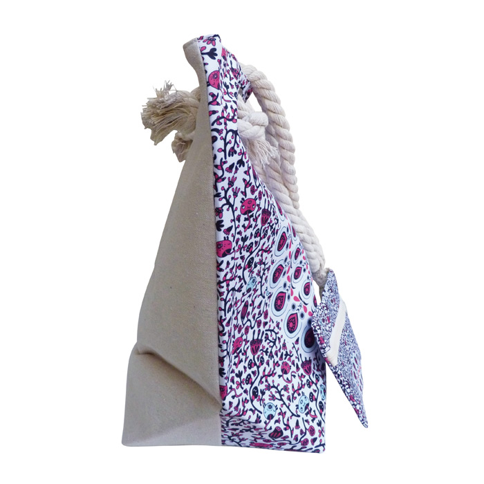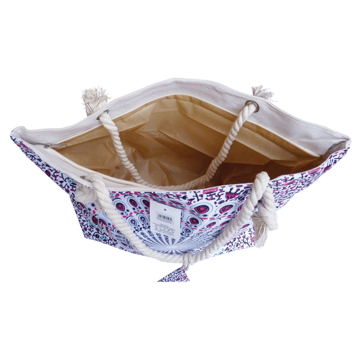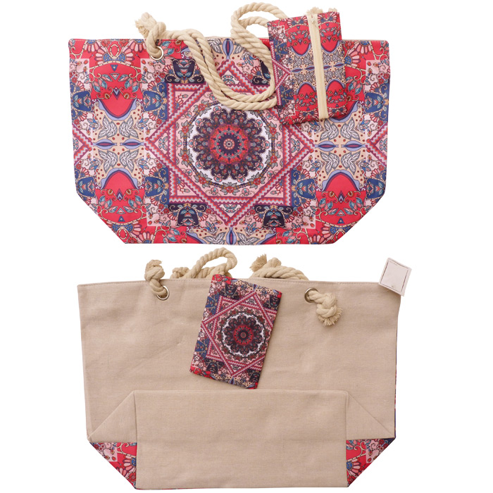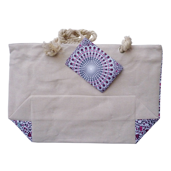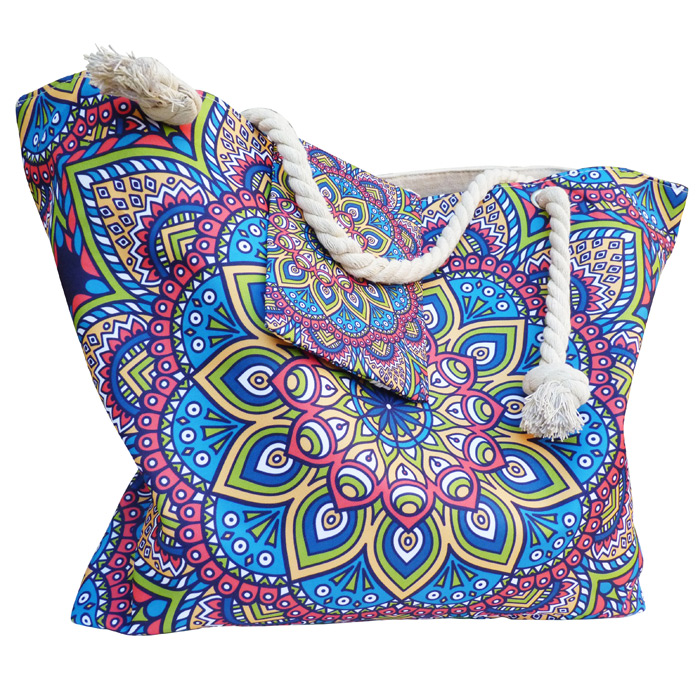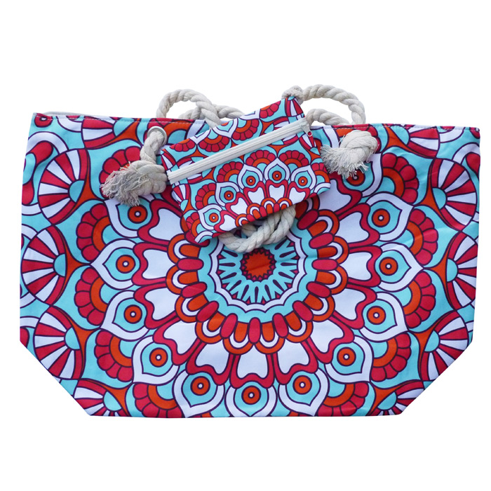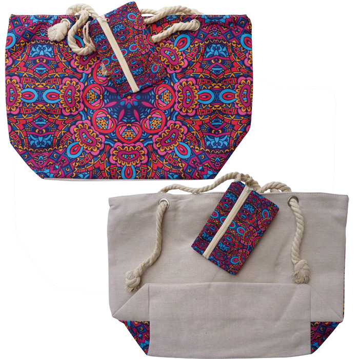 Sac de plage avec petite pochette à fermeture. Bandoulières en corde de marin et nœuds "marins" fermeture éclair sur le haut. Imprimé très colorés et différents avec motif "type mandala", sur un des côtés du sac, le côté opposé toile couleur sable. Doublure à l'intérieur. Lot de 2 pièces motifs aléatoires. Hauteur=36cm, Largeur=56cm , Base=18cm.