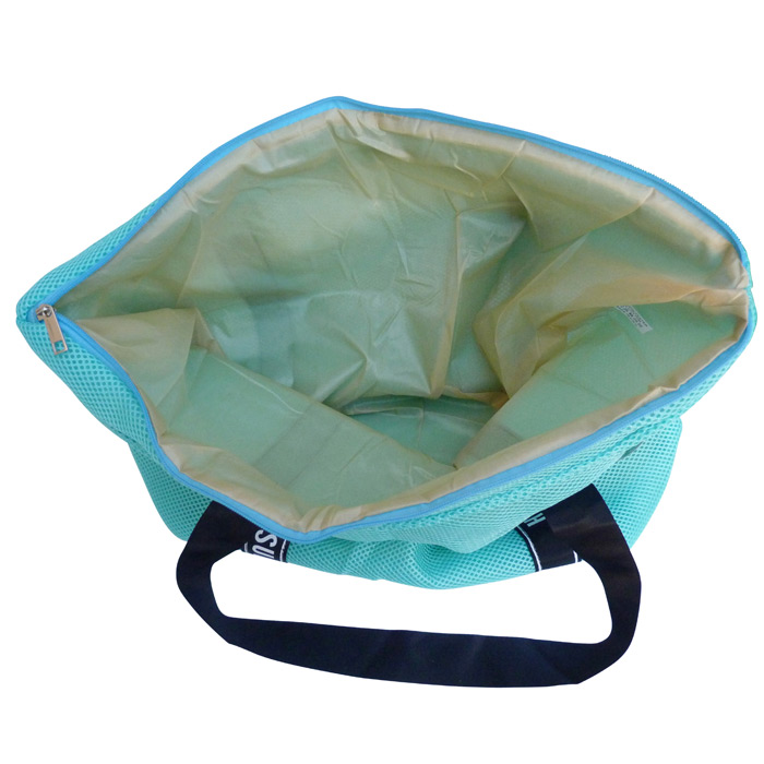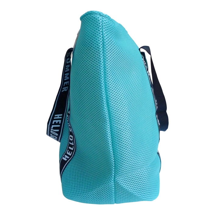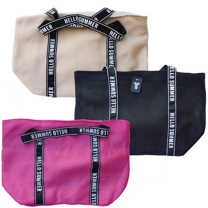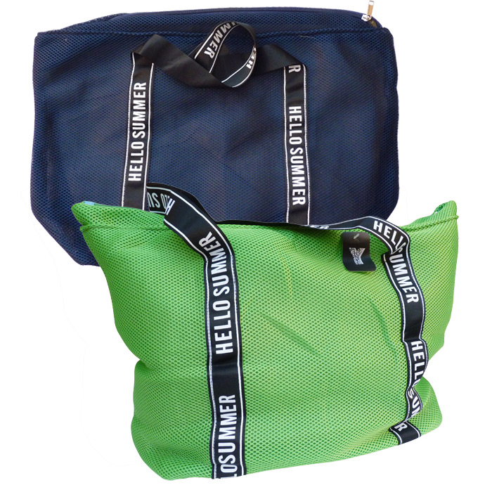 Sac léger de plage en Maille très colorées avec bandoulière noires et inscription "Hello Summer". Doublure à l'intérieur. Fermeture éclair sur le haut. Lot de 8 pièces couleurs aléatoires. Hauteur=38cm, Largeur=54cm , Base=18cm.
