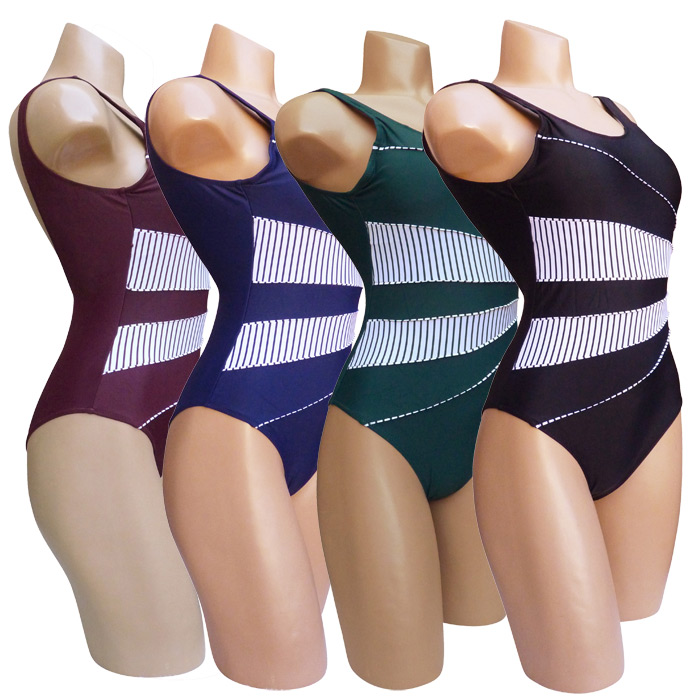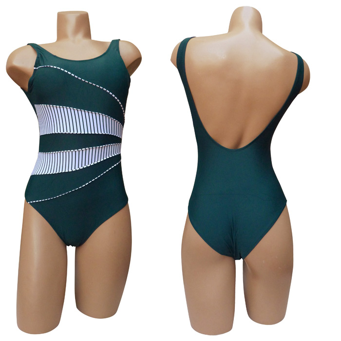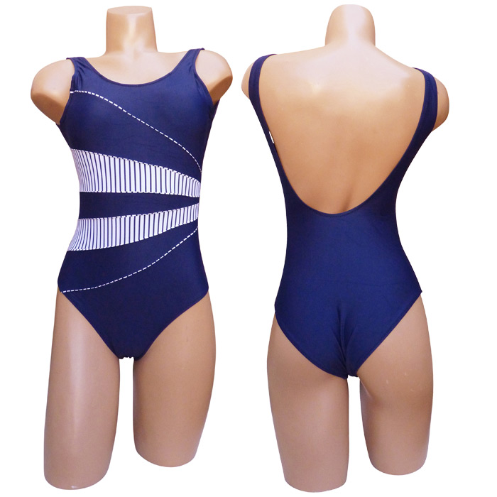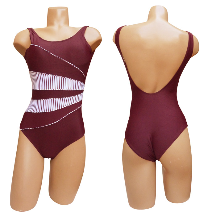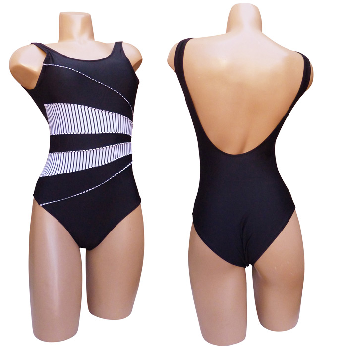 Maillot de bain femme 1 pièce, entièrement doublé, devant et derrière. Encolure arrondie, soutien gorge forme bandeau. Mousses intégrées et amovibles. Motif "graphique" sur le devant, unie à l'arrière. 4 tailles indiquée sur l'étiquette.