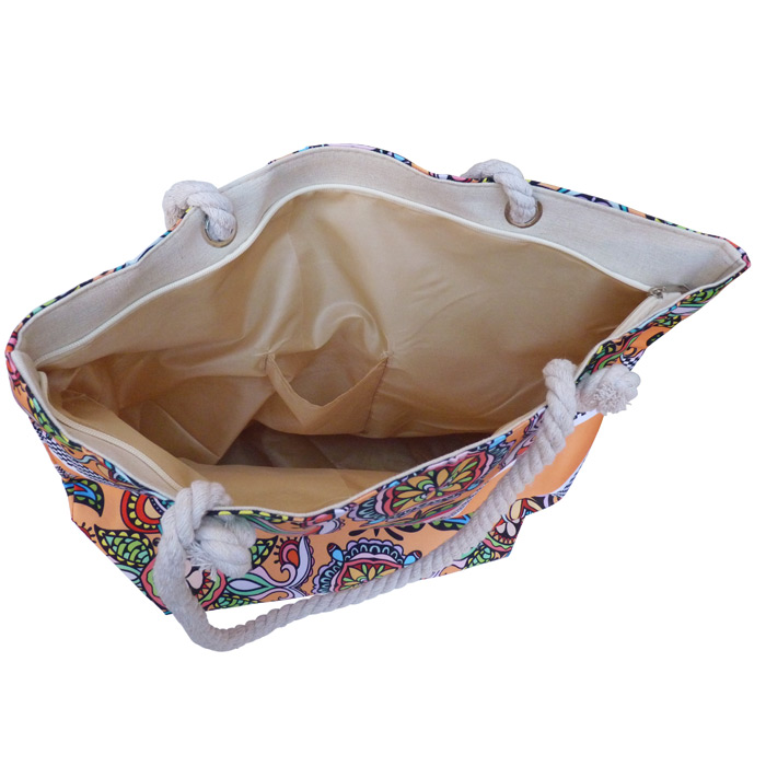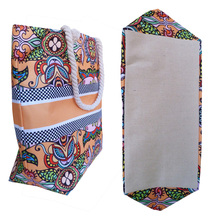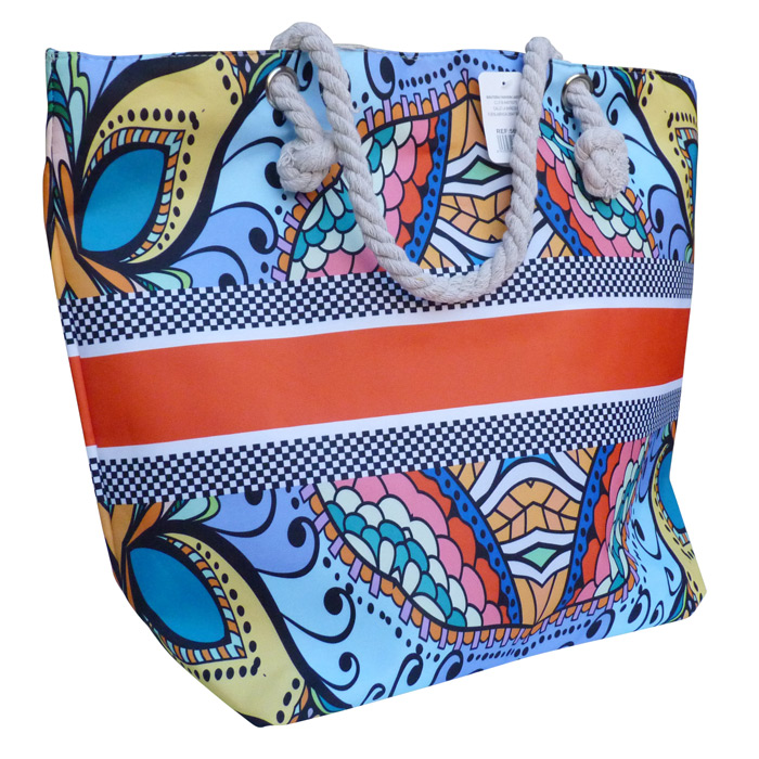Lot de 6 grands sacs de plage avec petite poche intérieur, fermeture éclair sur le haut. Fond du sac Doublé. Imprimé coloré avec 1 large bande colorée sur le milieu. Bandoulières en corde de marin et nœuds "marins". Hauteur=41cm, Largeur=53cm , Base=17cm.